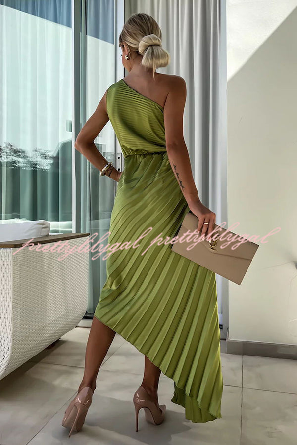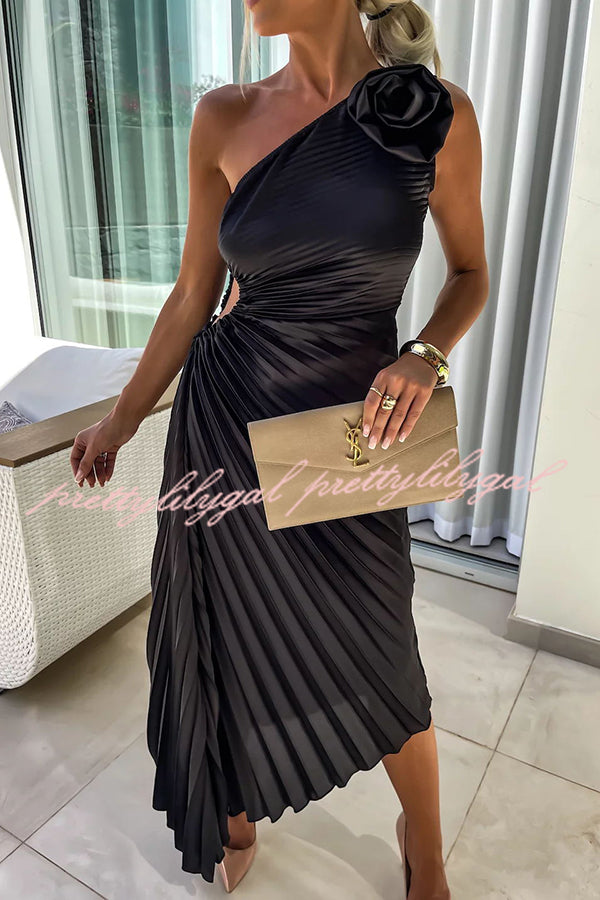 Romantic Nights Satin Raised Flower Elastic Cutout One Shoulder Pleated Maxi Dress