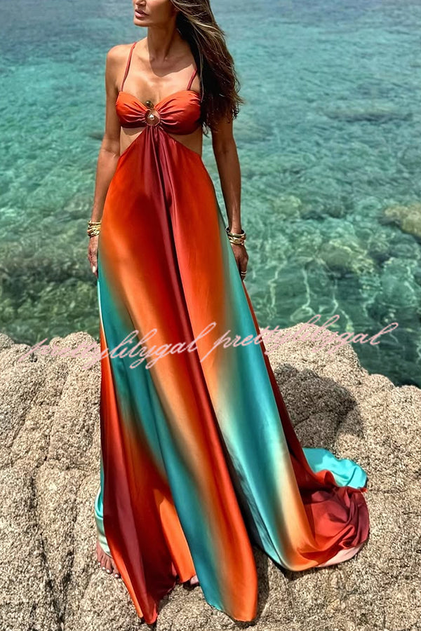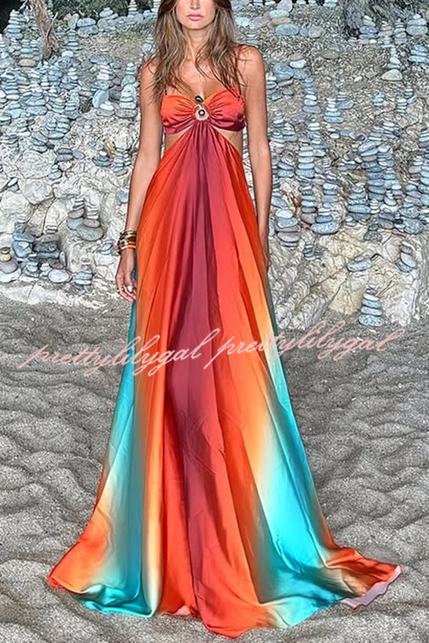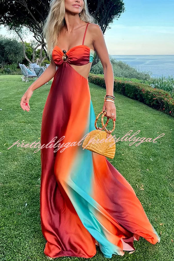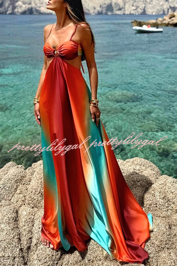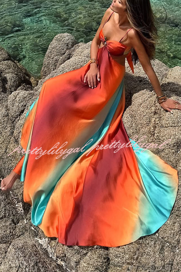 Neon Sunset Printed Metal Decoration Cutout Back Tie-up Vacation Maxi Dress