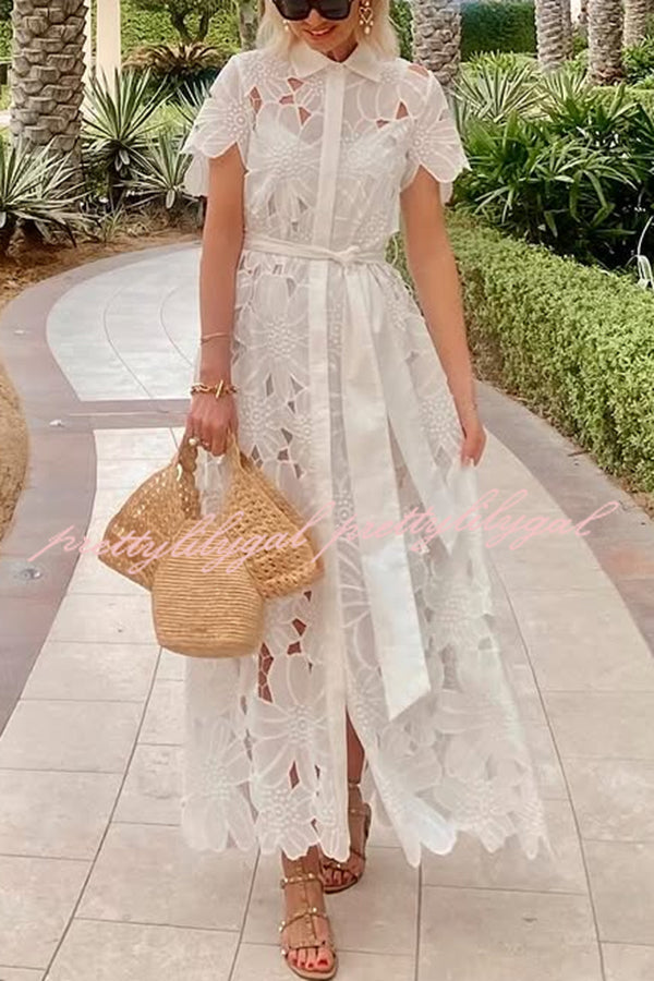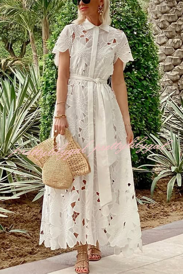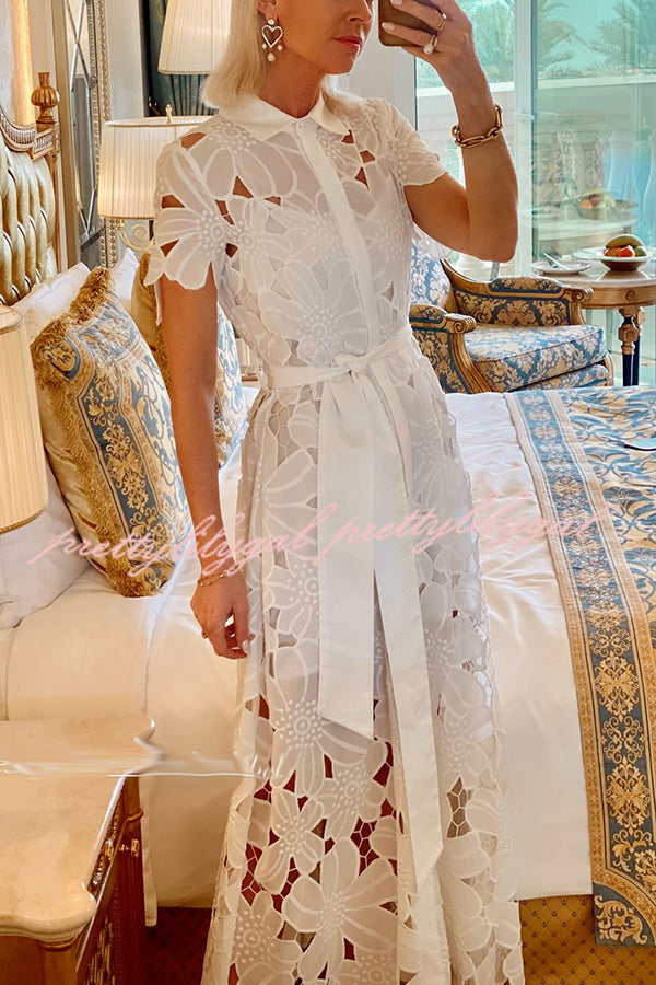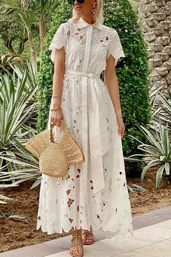 Dubai Style Floral Crochet Lace Short Sleeve Tie-up Shirt Maxi Dress