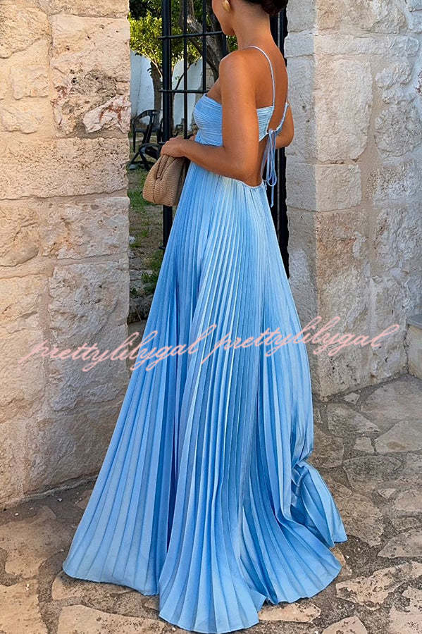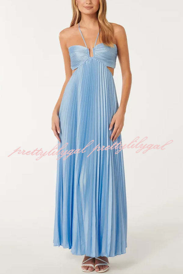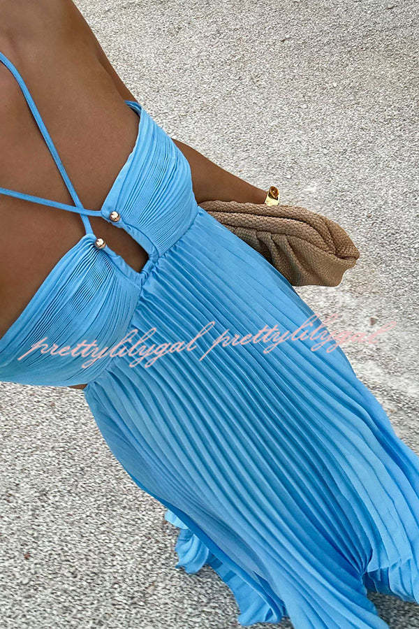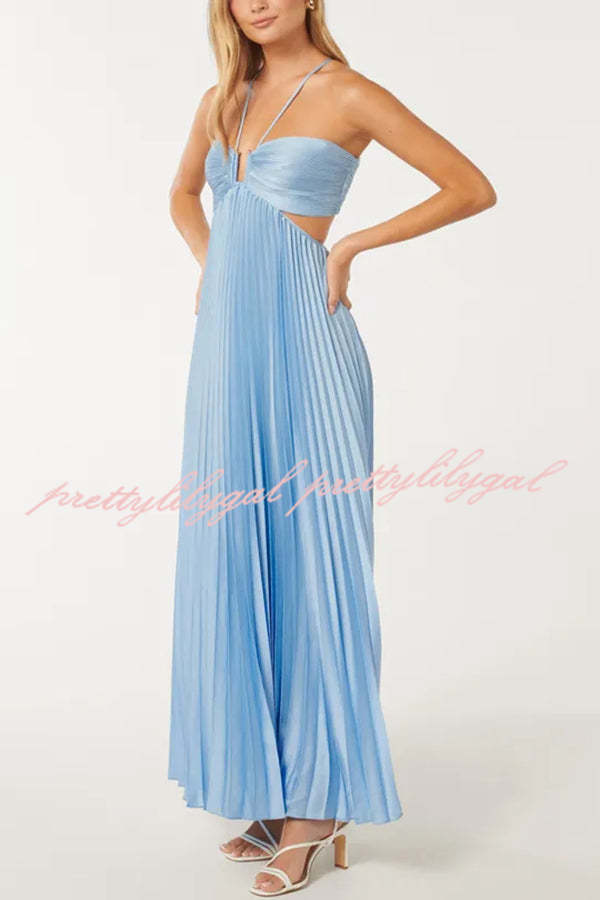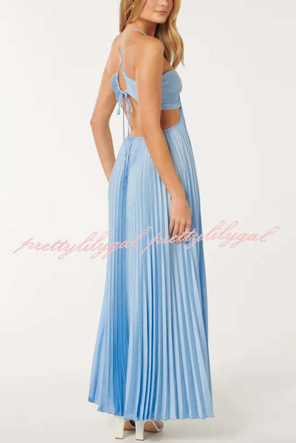Caught Your Eye Satin Pleated Cross Straps Cutout Flowing Maxi Dress