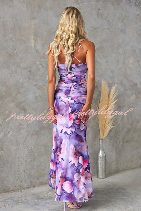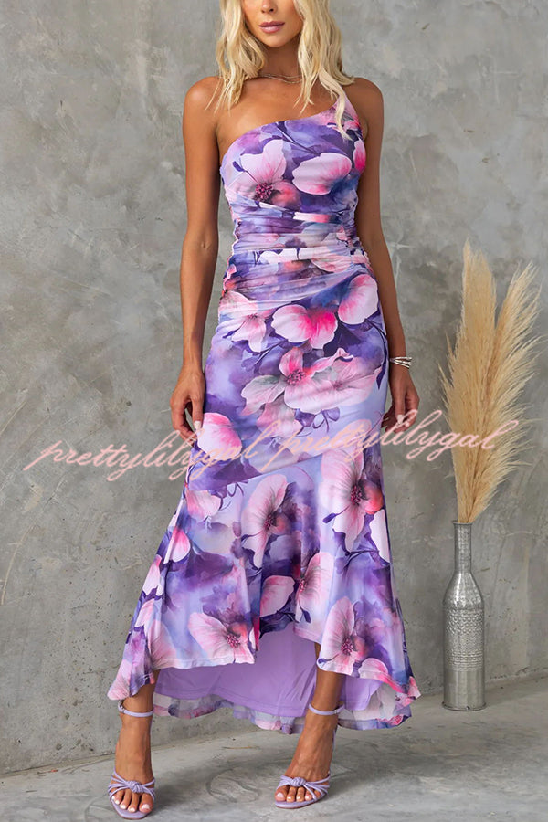 Deja Mesh Overlay Floral Print One Shoulder Ruched Stretch Maxi Dress