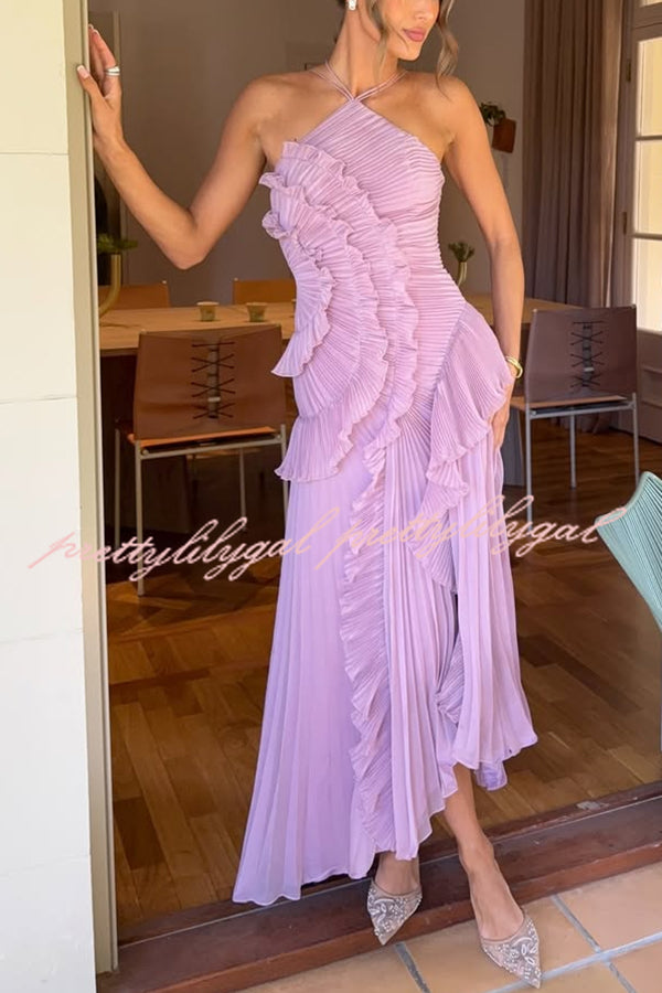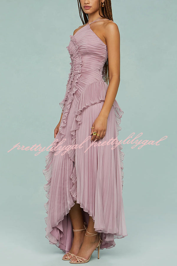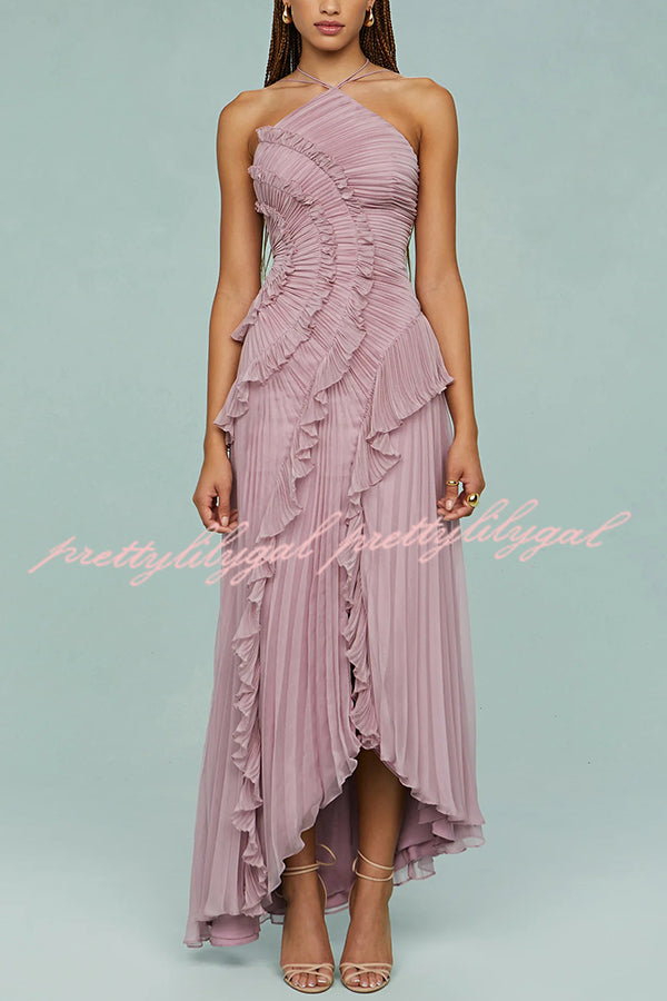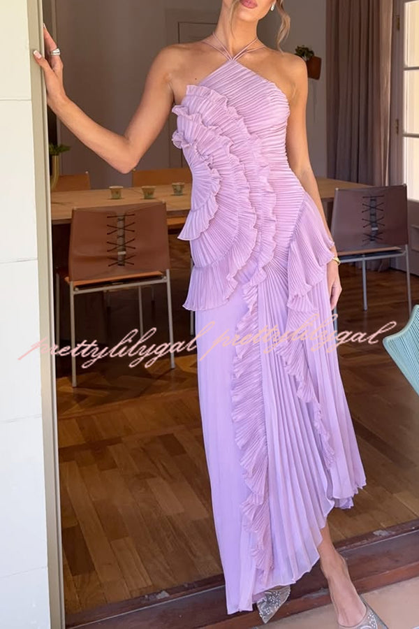 Dream Ode Lily Pad Style Pleats and Ruffles Halter Gown Maxi Dress