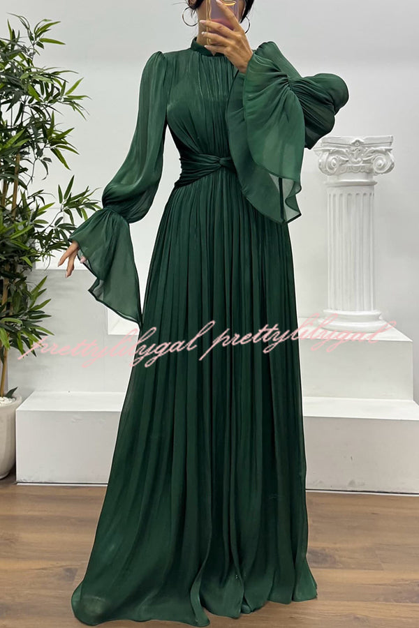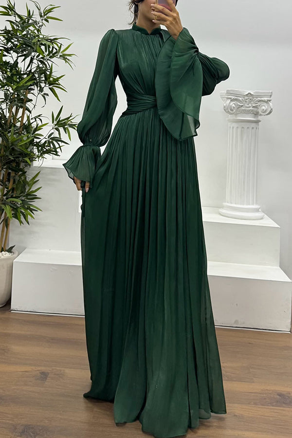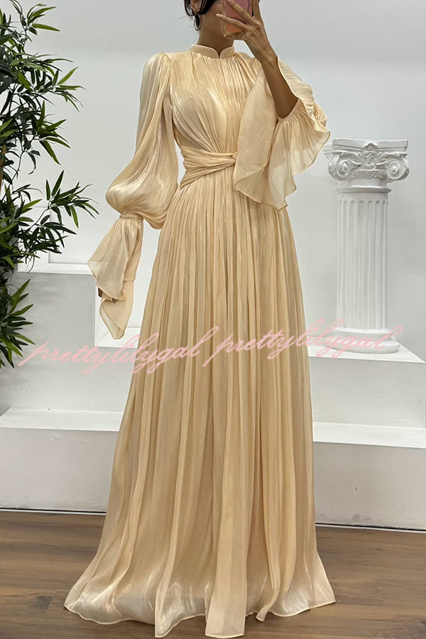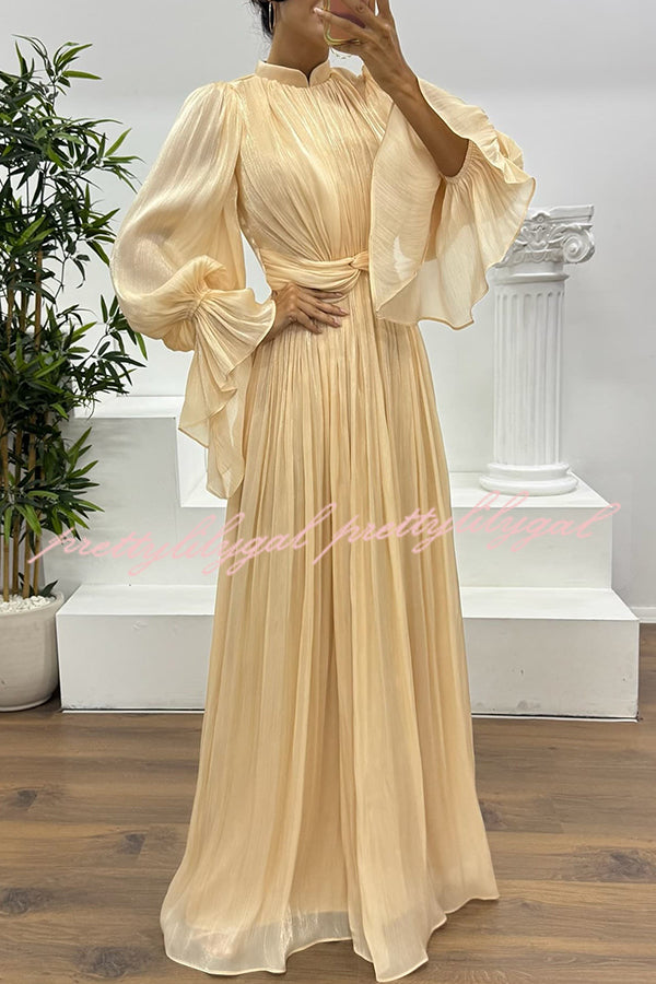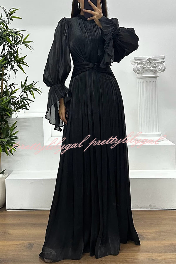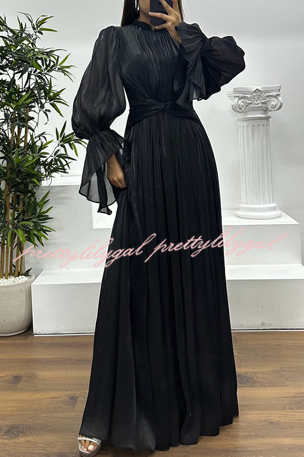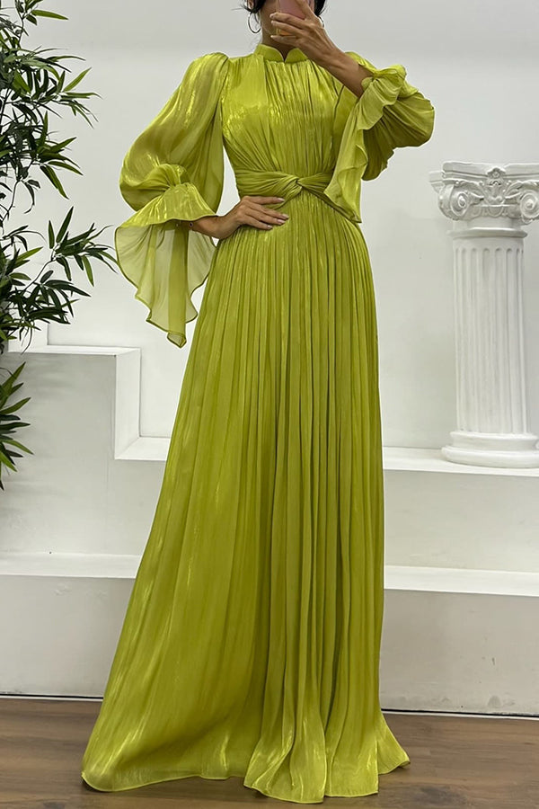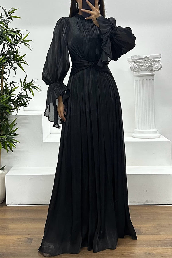 Ellah Shiny Fabric Chinese Stand Collar Twist Waist Balloon Sleeve Maxi Dress