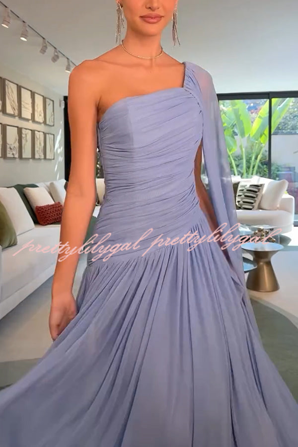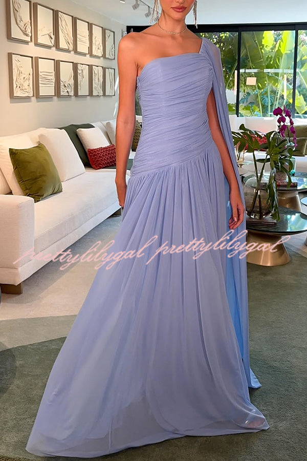 End of Light Chiffon One Shoulder Single-sleeve Shawl Ruched Maxi Dress