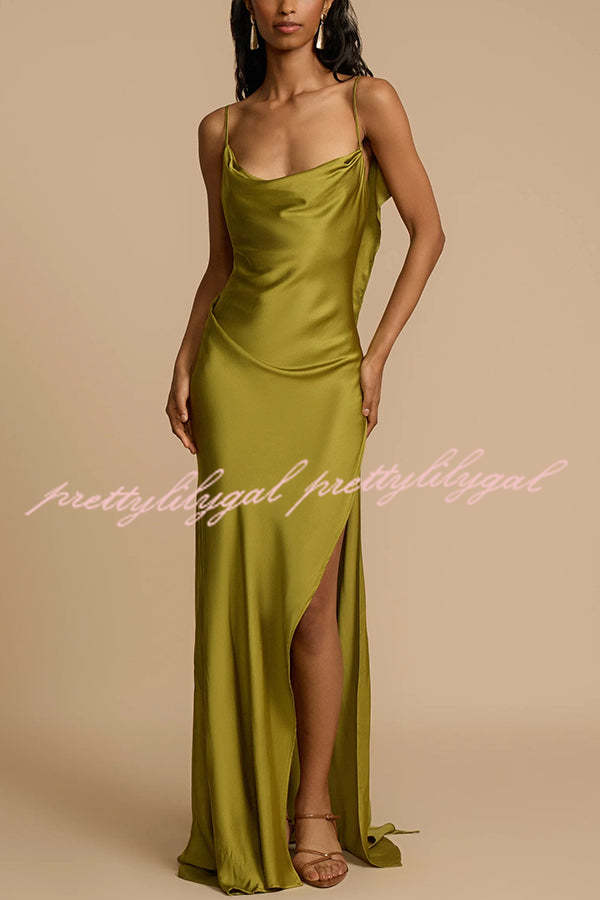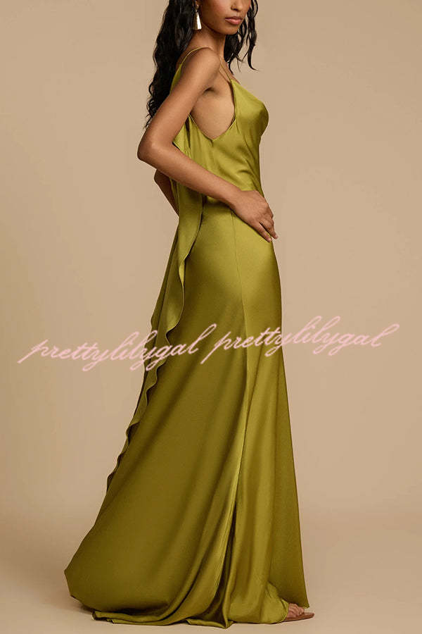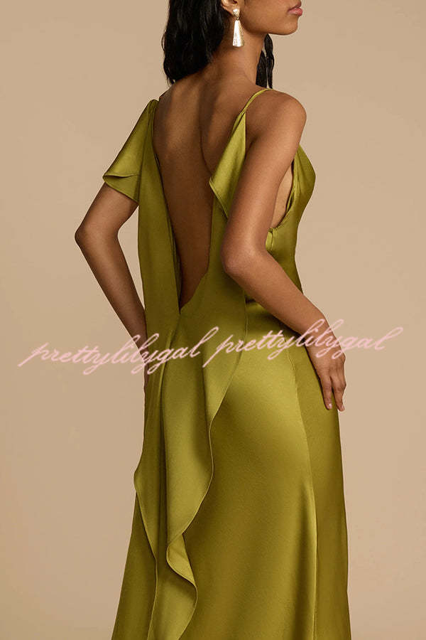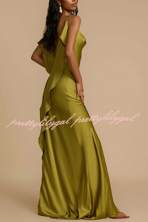 Evening Date Satin Cowl Neck Drape Ruffle Backless Bias Cut Party Maxi Dress