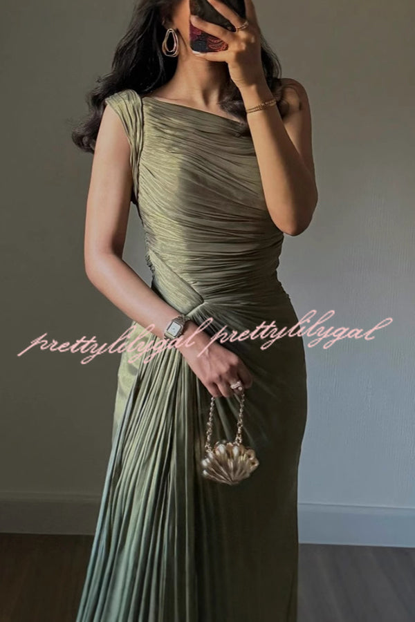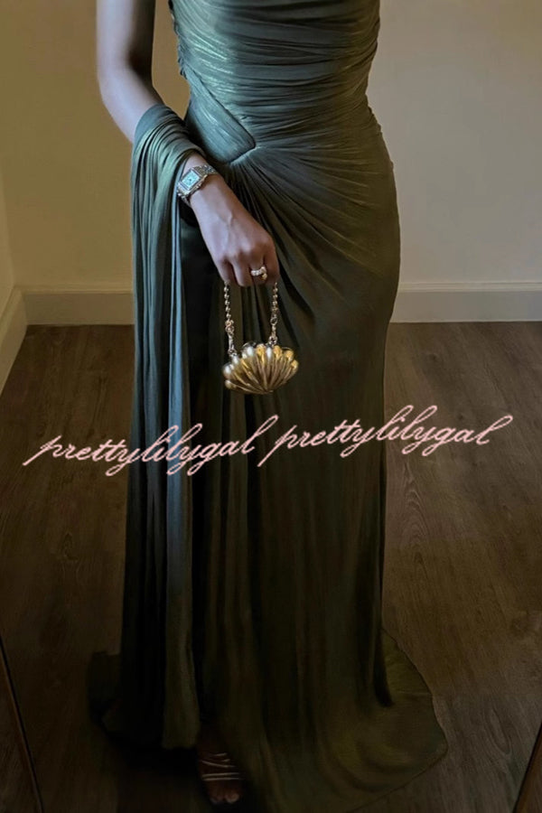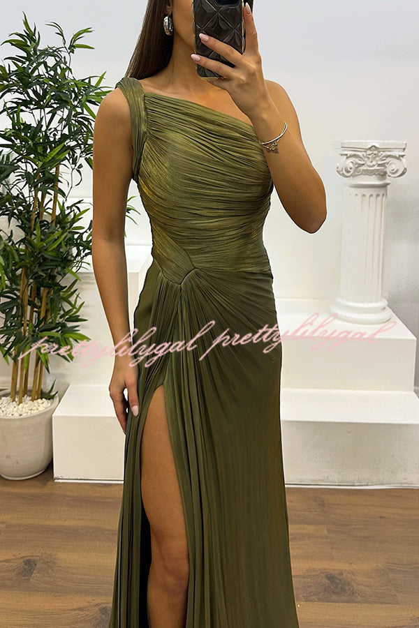 Fashion One-shoulder Pleated Ribbon Slim Slit Maxi Dress