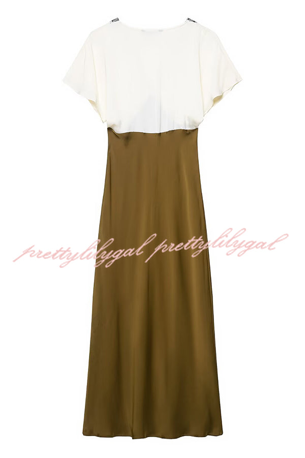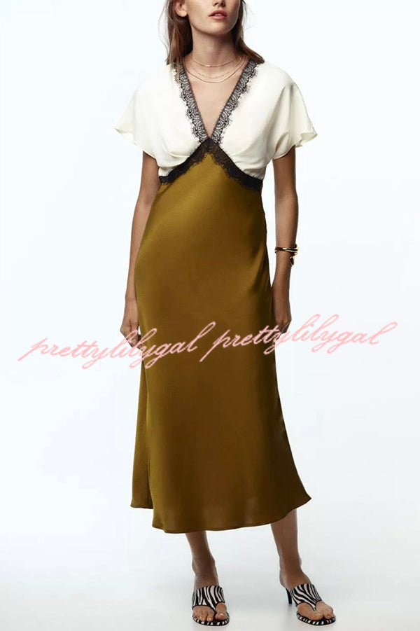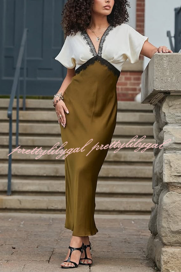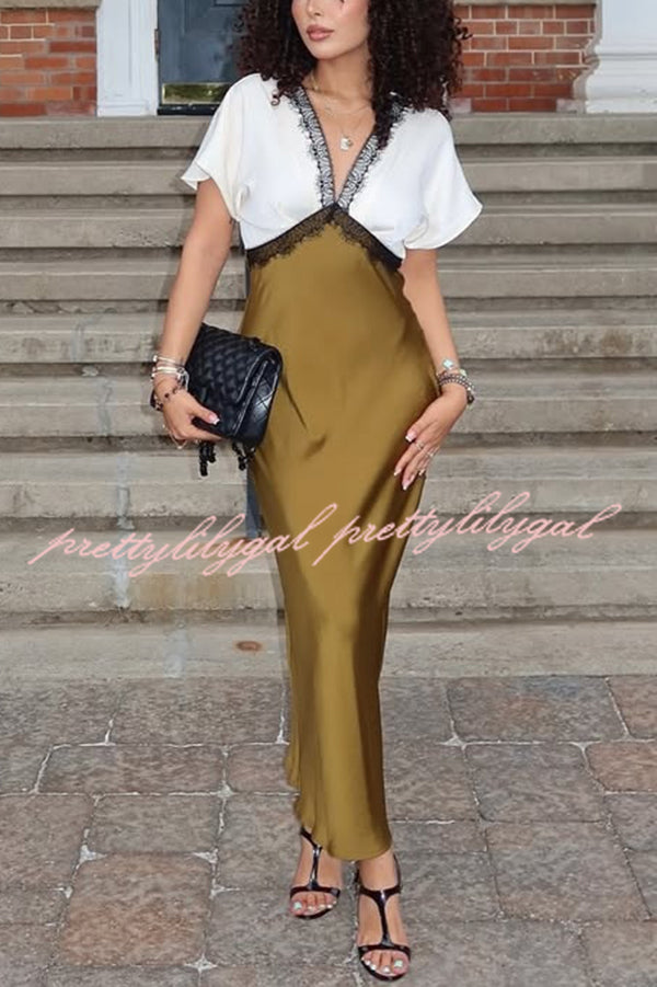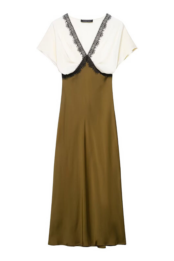 Fashionable Contrast Color V-neck Lace Stitching Maxi Dress