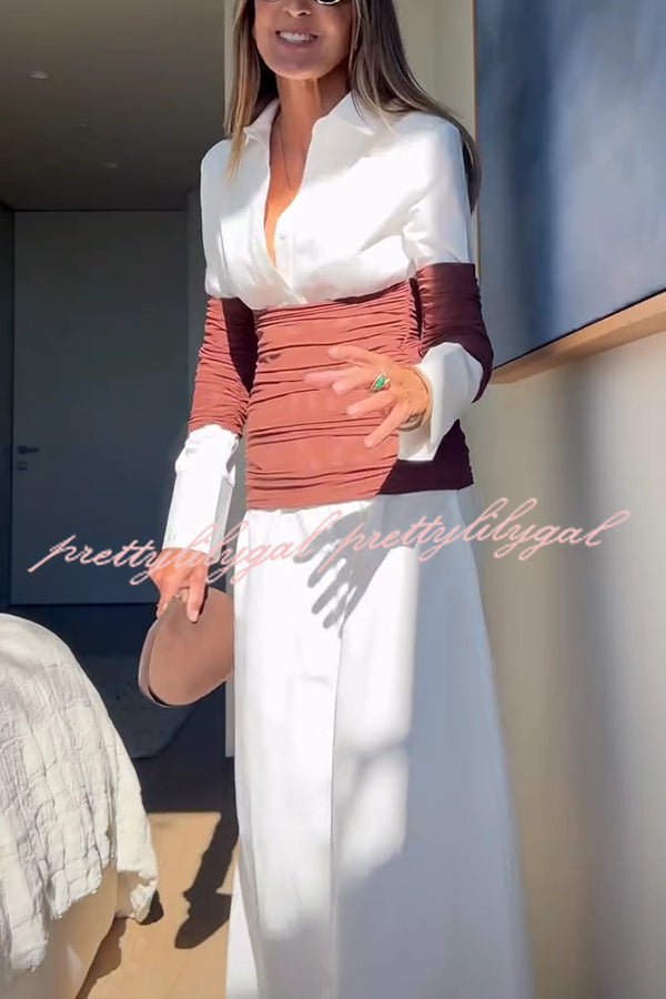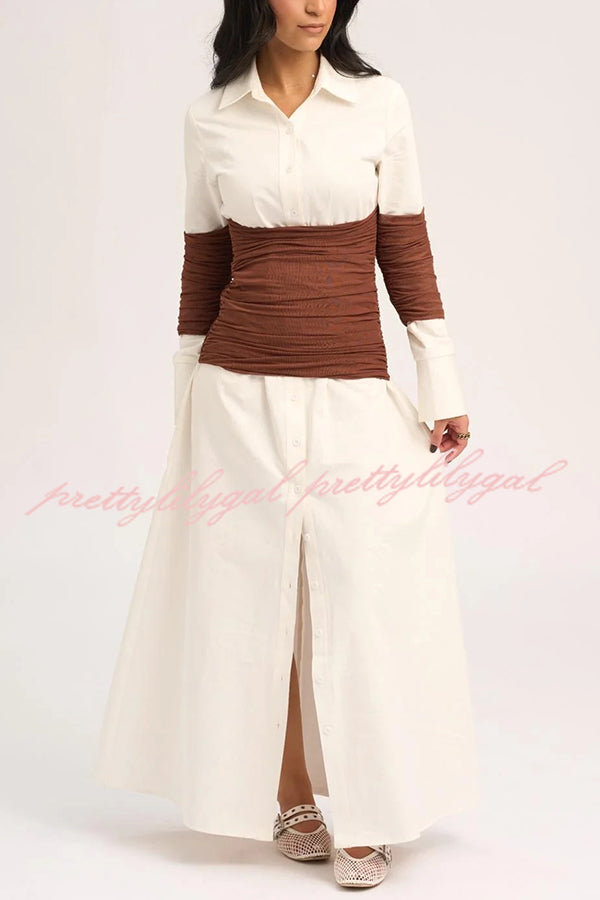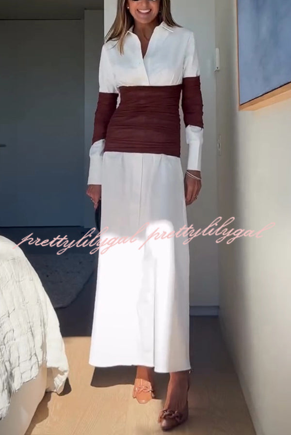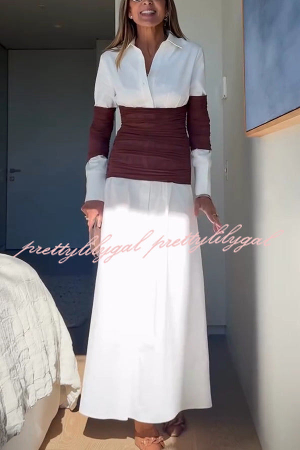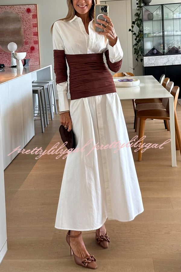 Fashionable Pleated Contrast Patchwork Waist Long Sleeve Button Shirt Maxi Dress