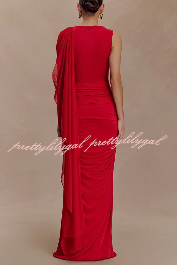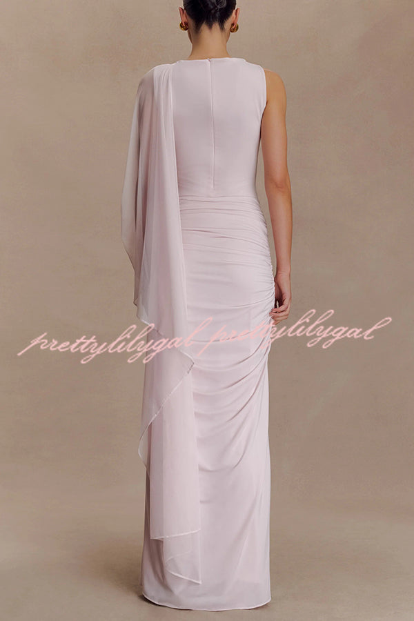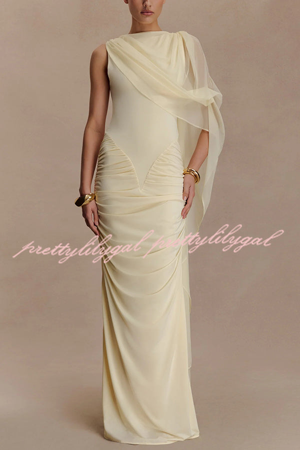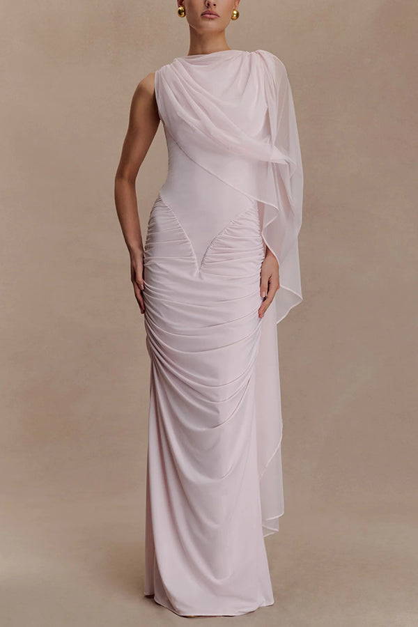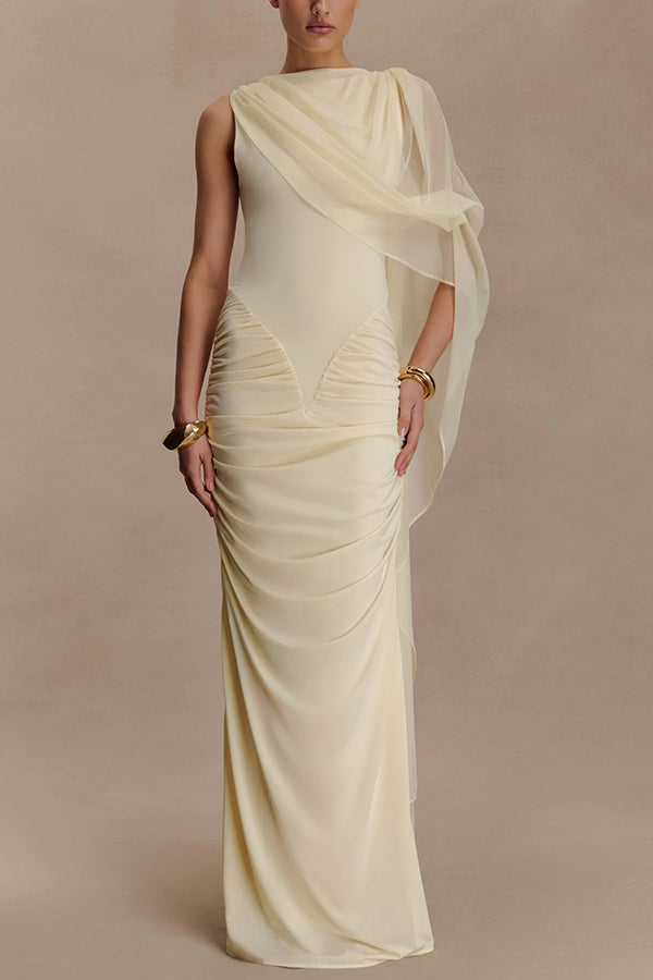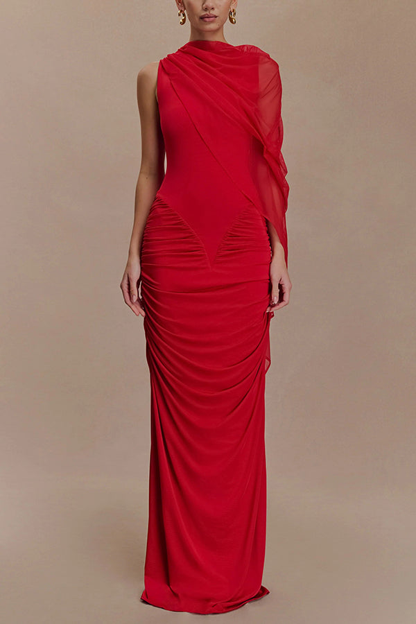 Fashionable Mesh Shawl Sleeveless Slim Fit Pleated Maxi Dress
