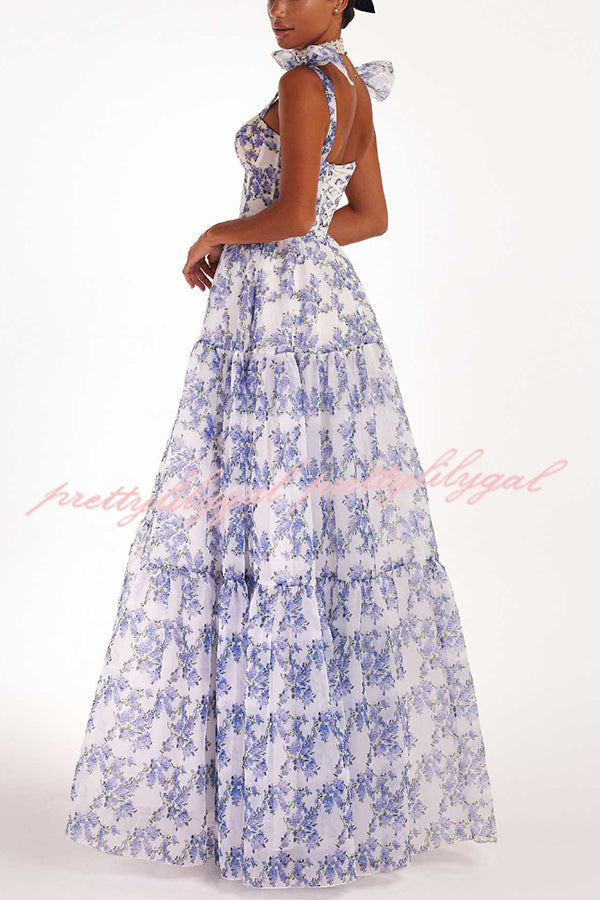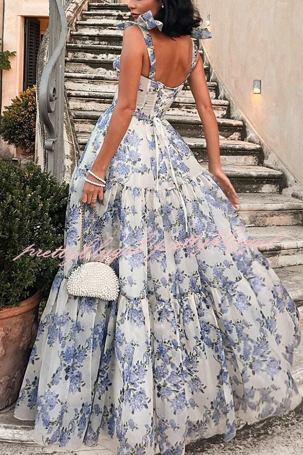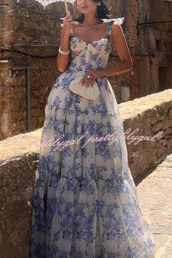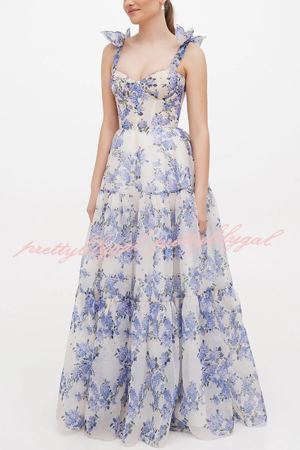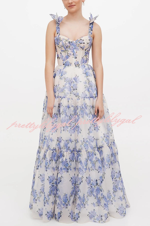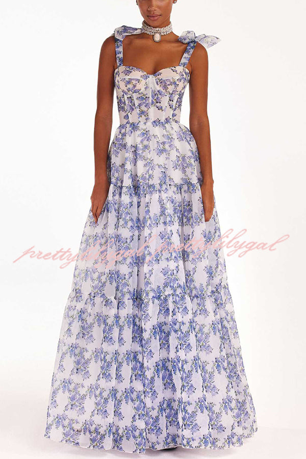 Fairytale Itself Organza Floral Print Tie Strap Maxi Dress