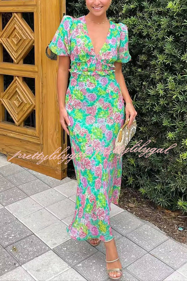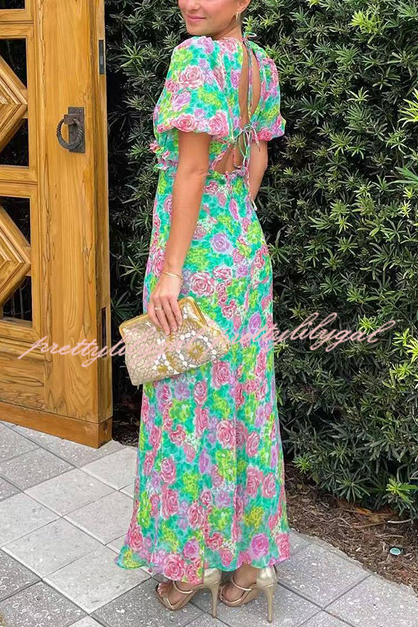 Floral Print V-neck Puff Sleeve Open-back Maxi Dress