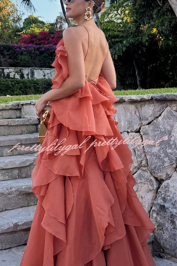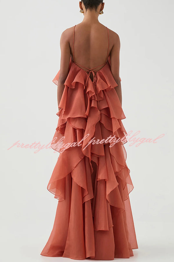 Free - Flowing Rose Detail Tiered Ruffles Halter A-line Maxi Dress