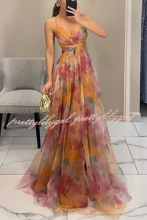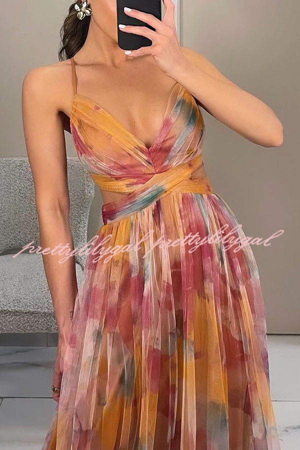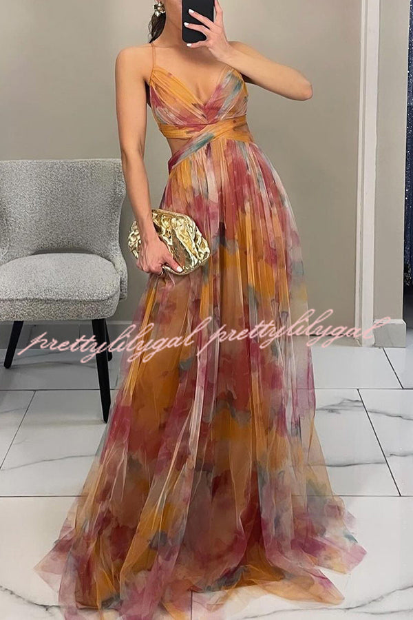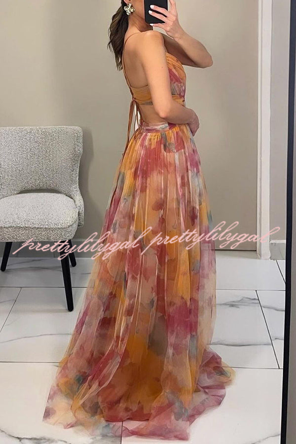 Giselle Tulle Render Floral Print Cutout Waist Back Lace-up Maxi Dress