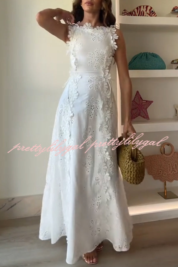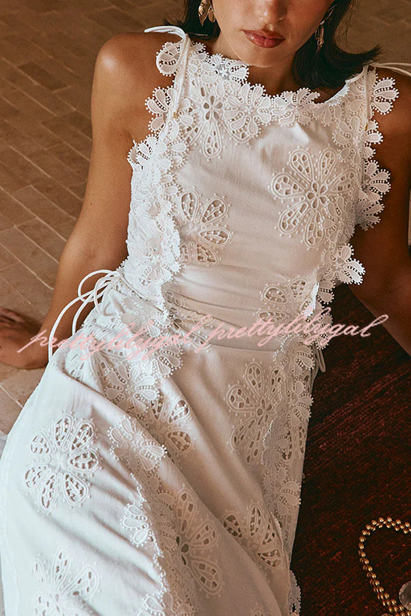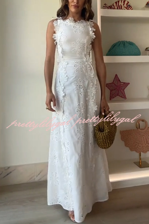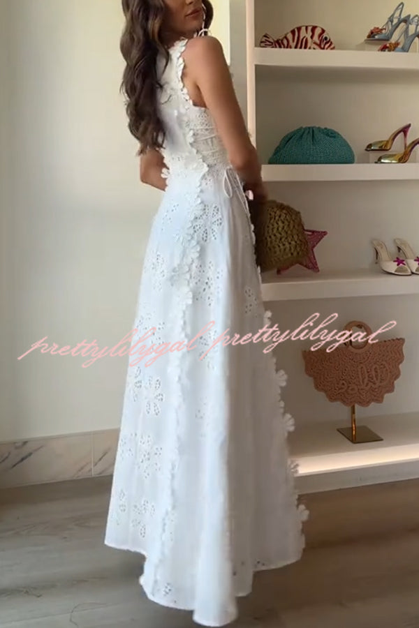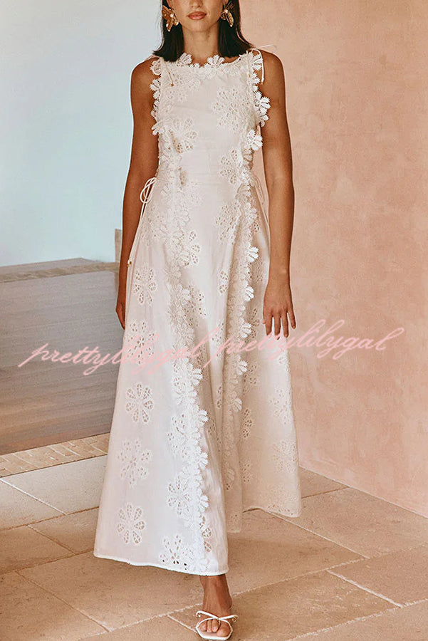 Mairi Embroidery Hollow Fabric Delicate Flower Trim Side Lace-up Maxi Dress