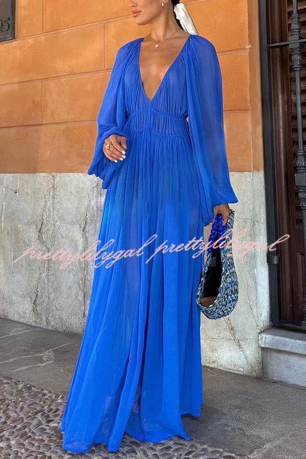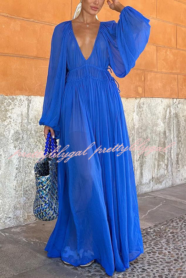 Blue Gemstone Chiffon Ruched Gathered Waist Maxi Dress