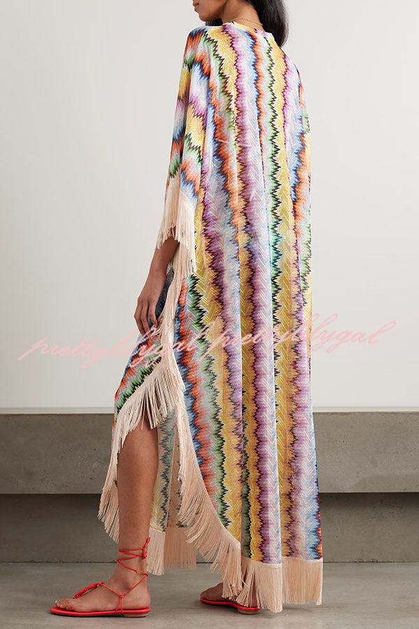 Mezcal Knit Colorful Zigzag Pattern Tassle Trim Loose Kaftan Maxi Dress