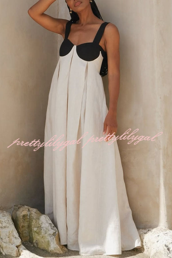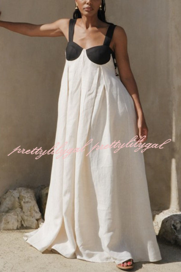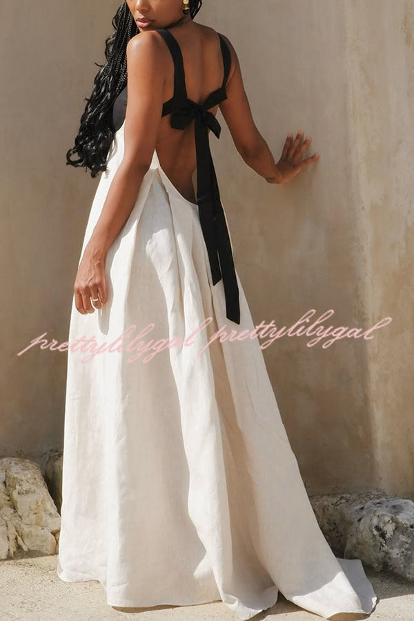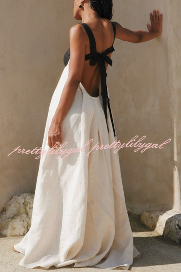 Jordina Linen Blend Colorblock Cups Backless Tie-up Loose Maxi Dress