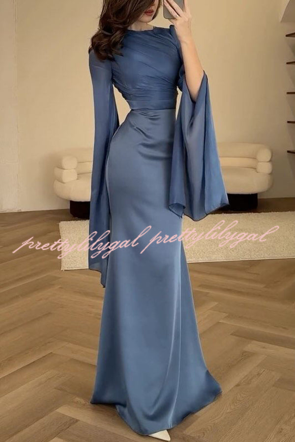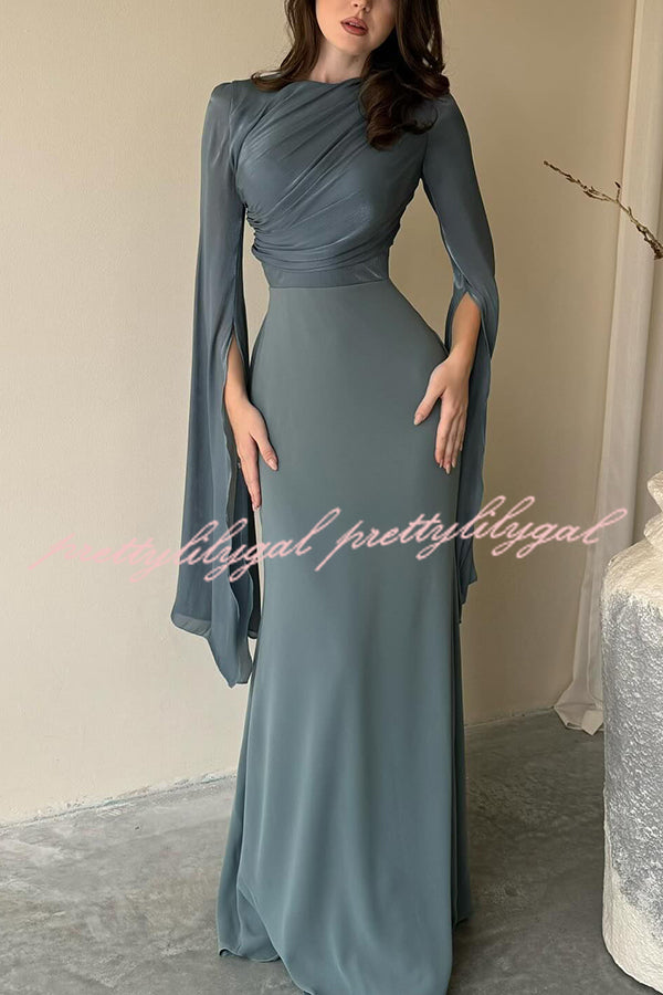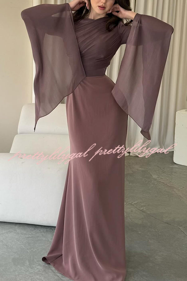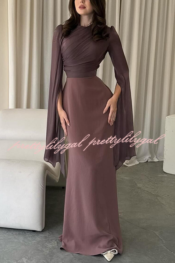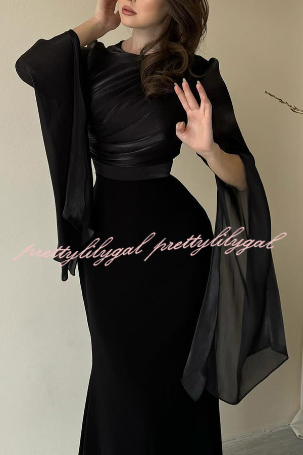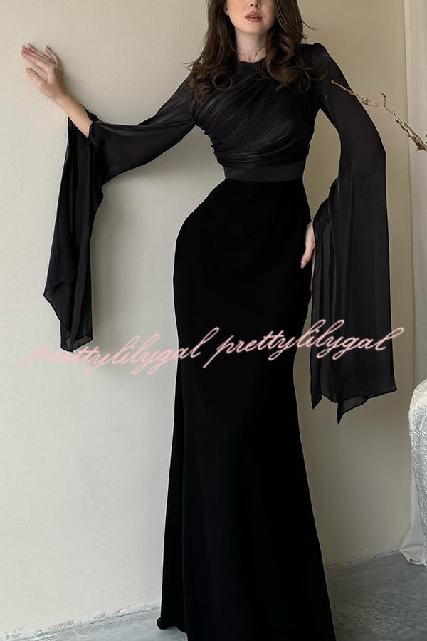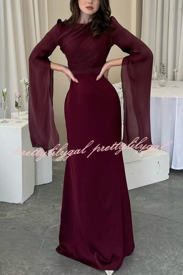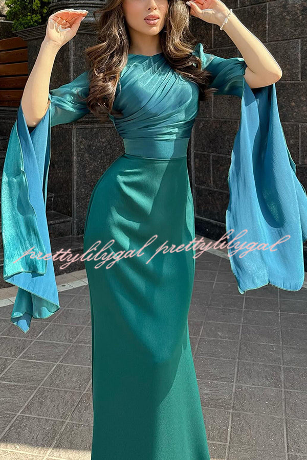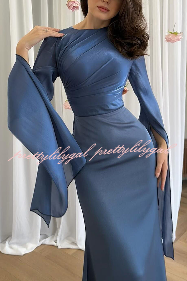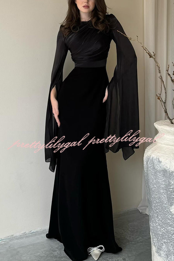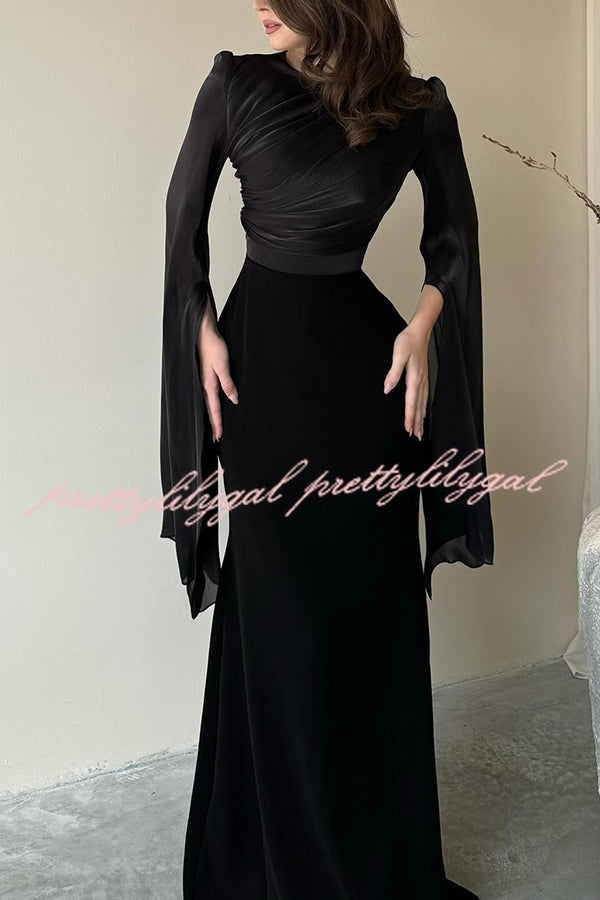 Liora Ruched Organza and Satin Patchwork Design Long Bell Slit Sleeve Maxi Dress