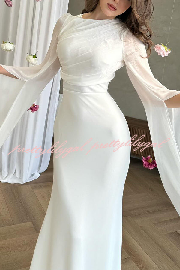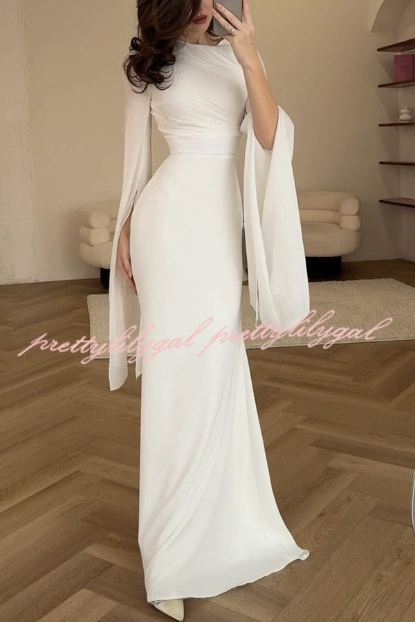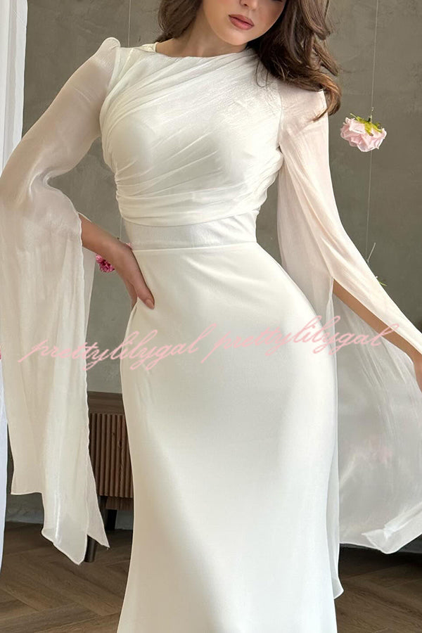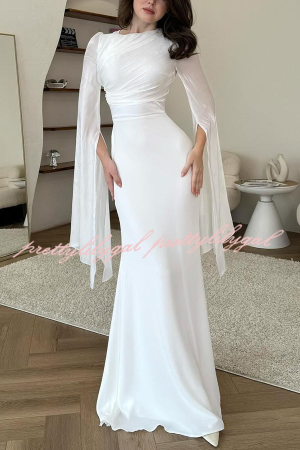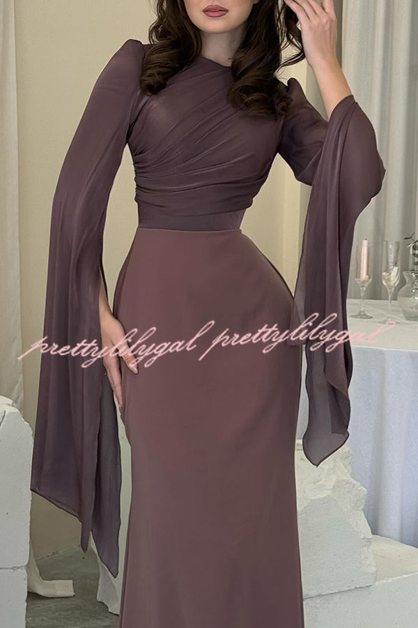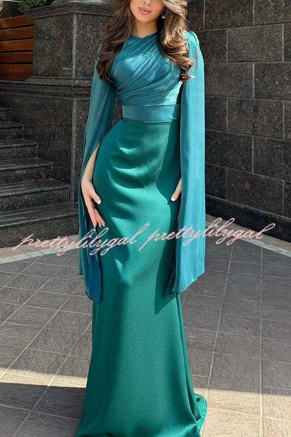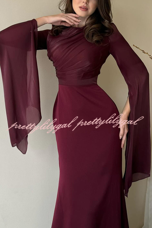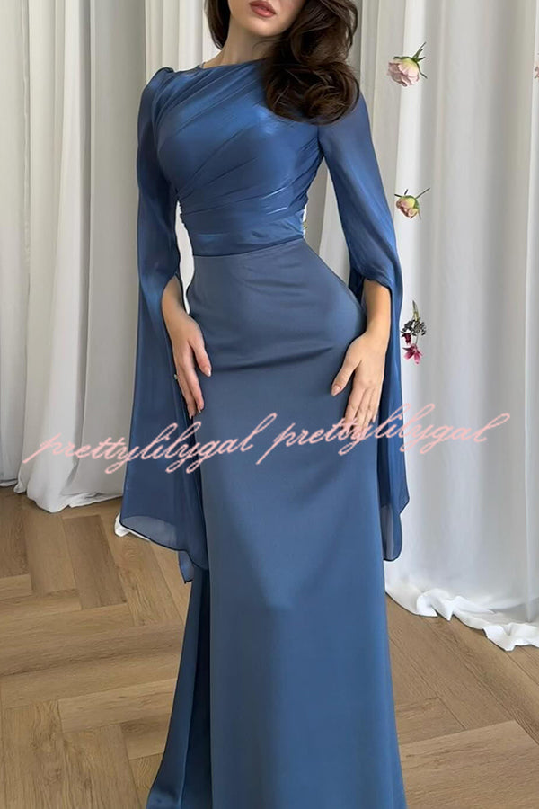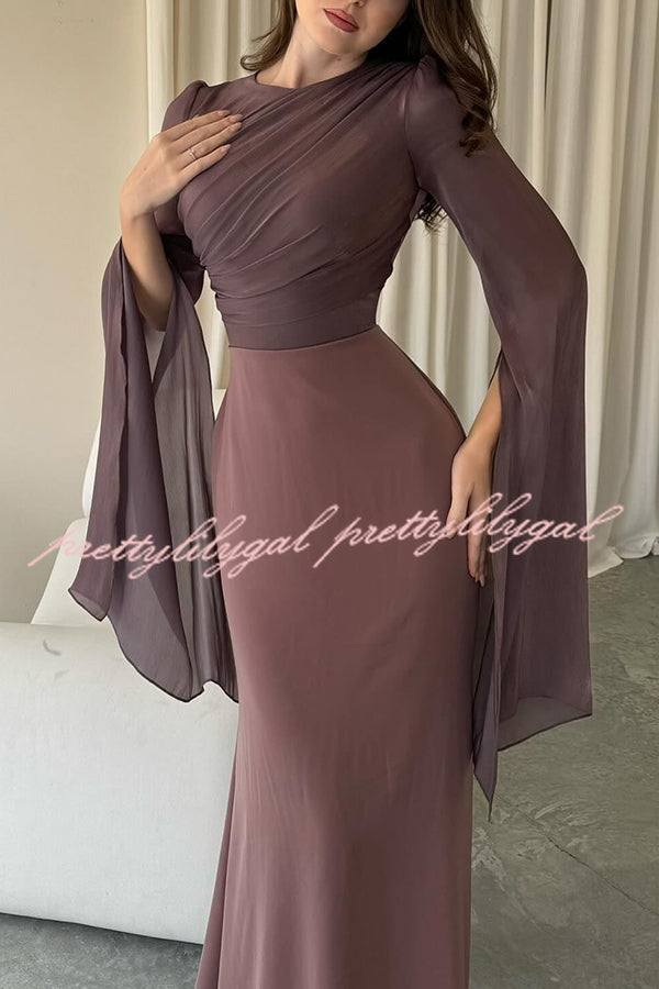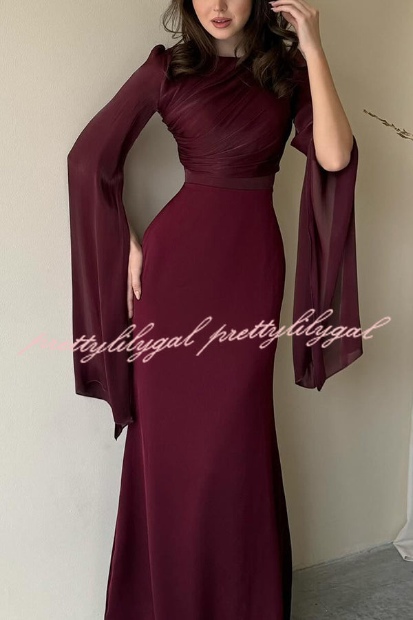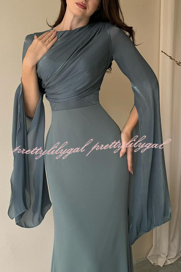 Liora Ruched Organza and Satin Patchwork Design Long Bell Slit Sleeve Maxi Dress