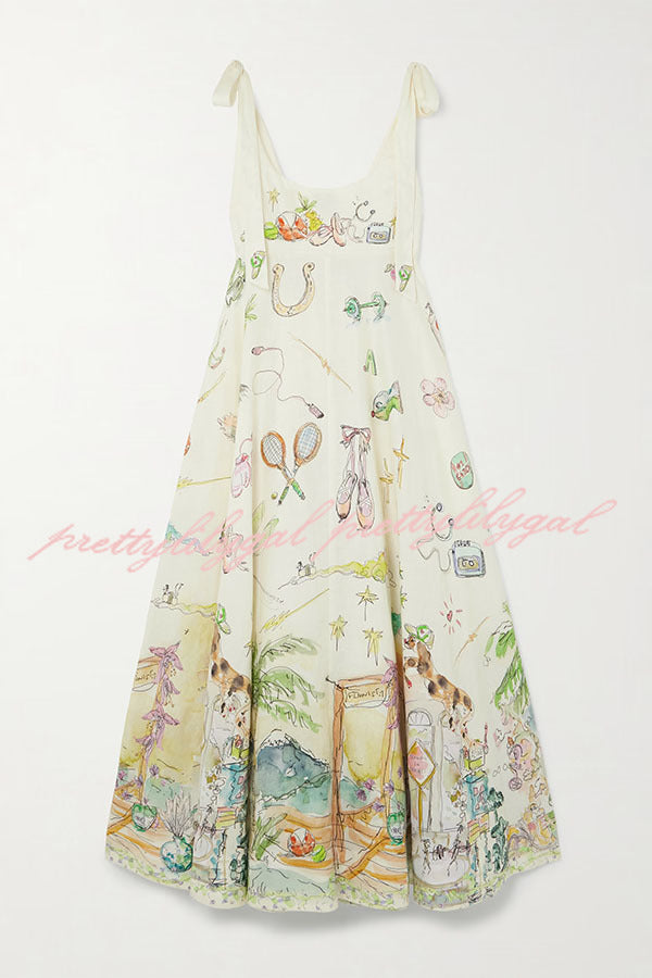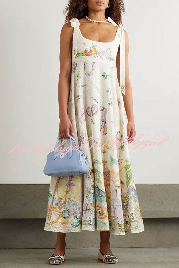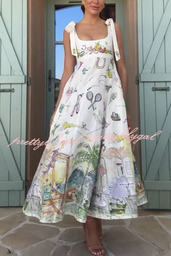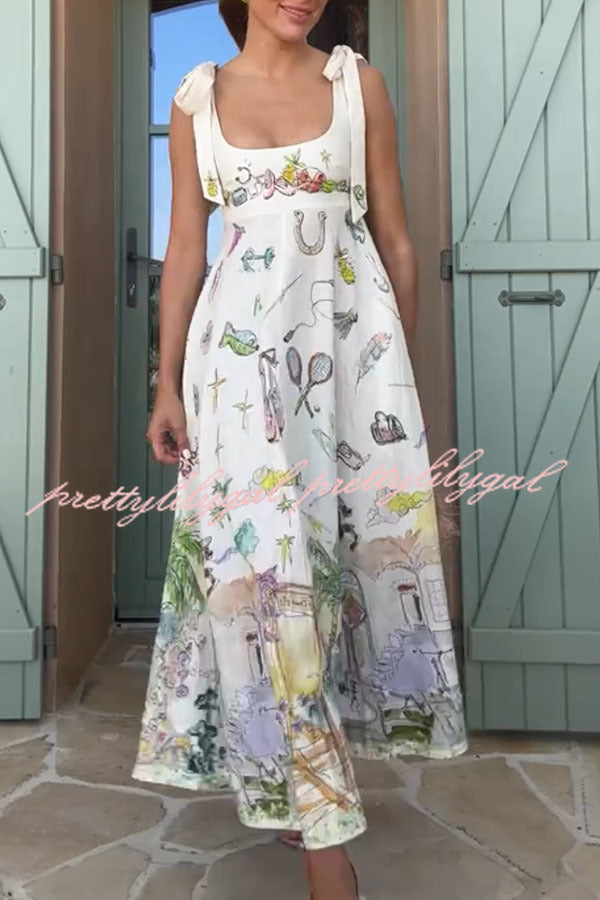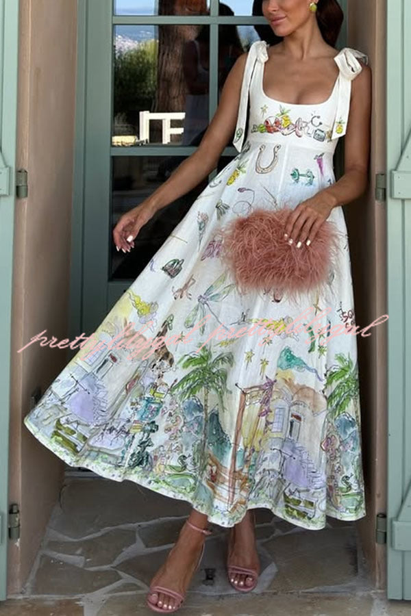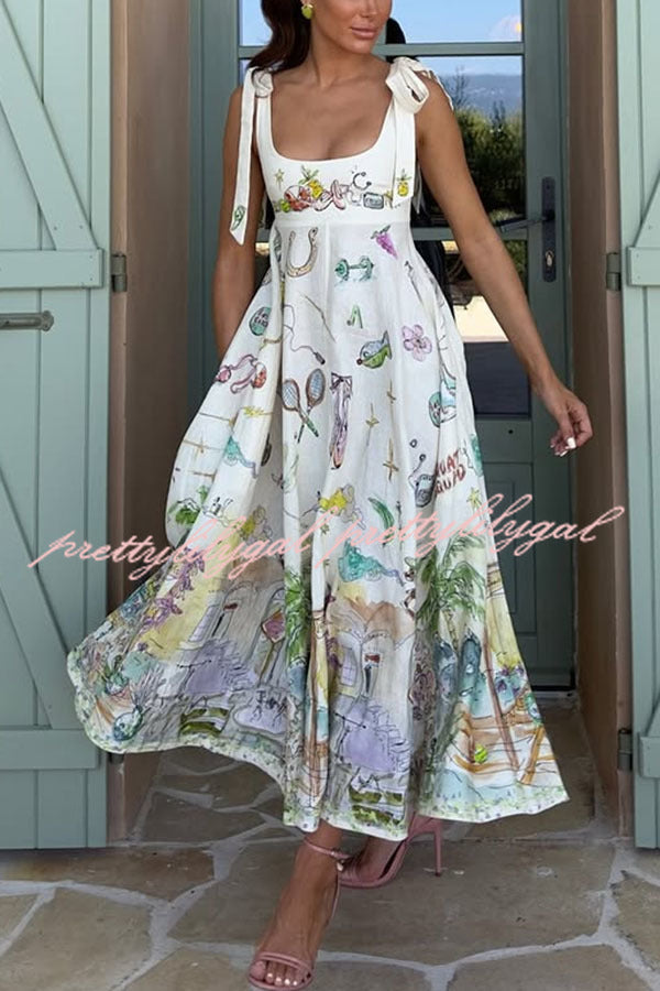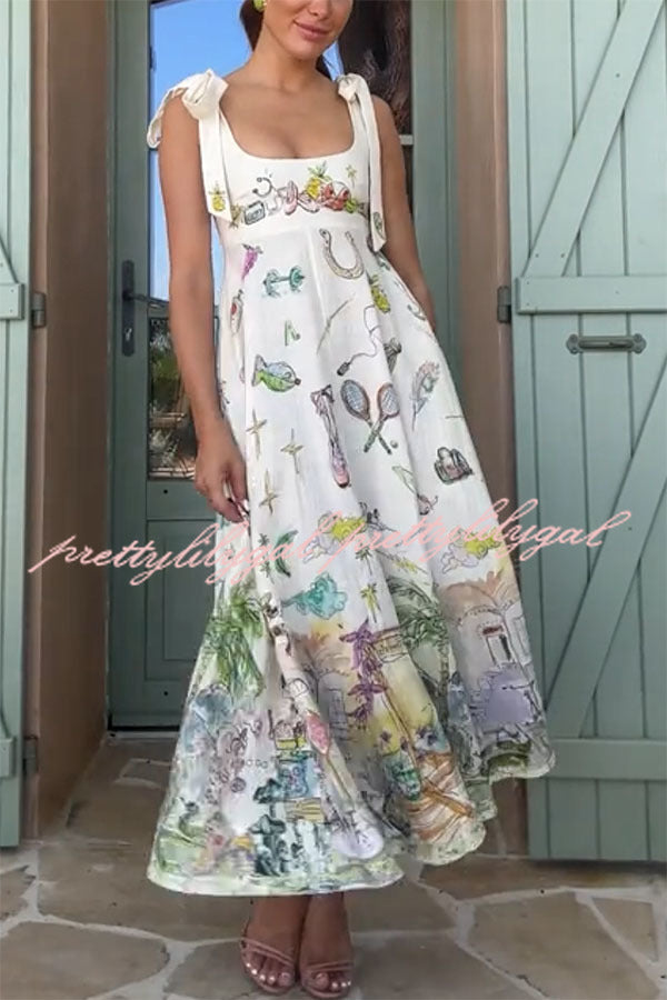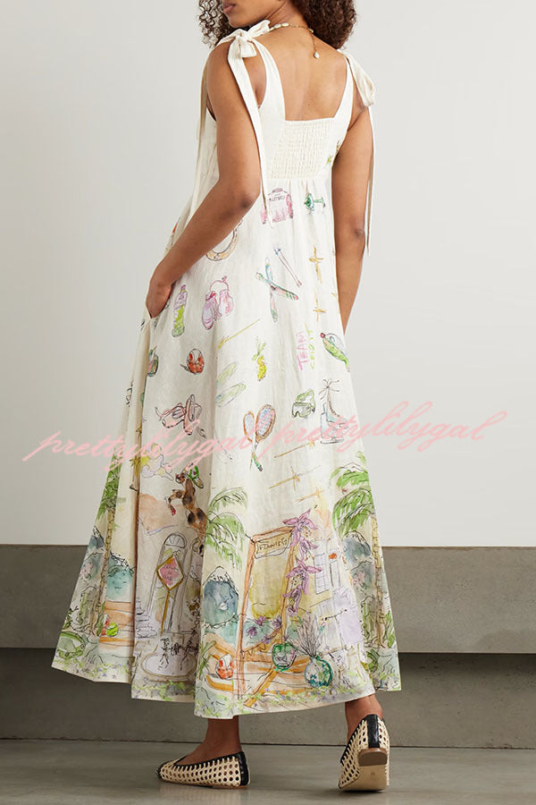 Euro Summer View Linen Blend Unique Print Tie-up Straps Pocket Midi Dress