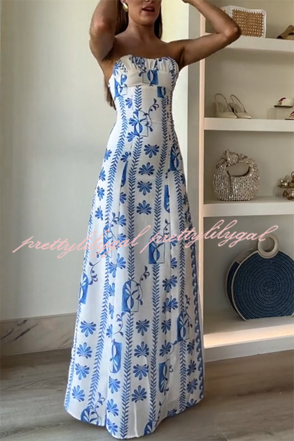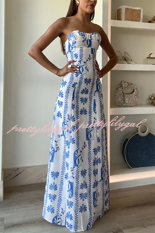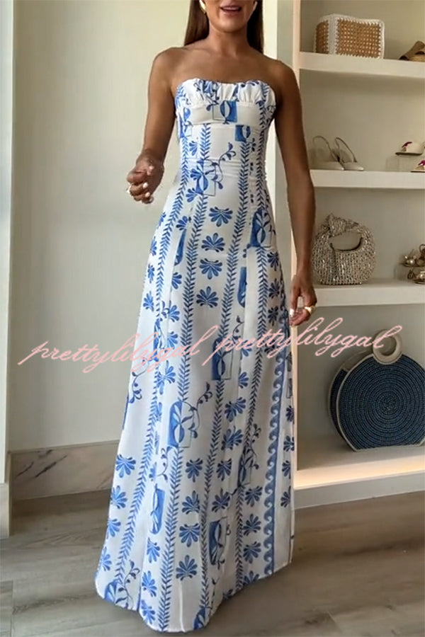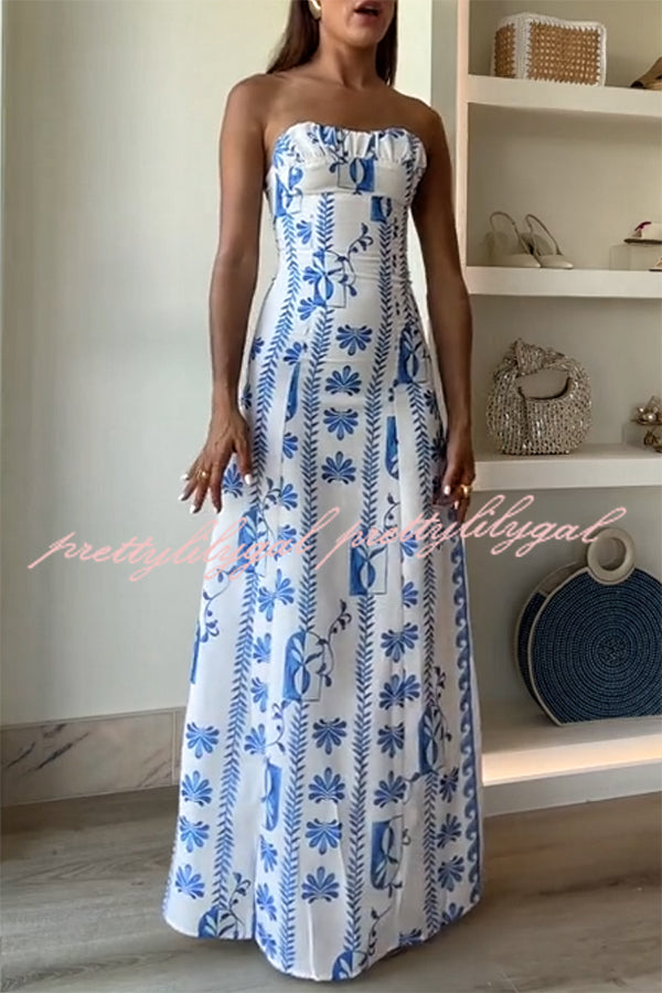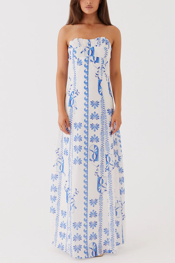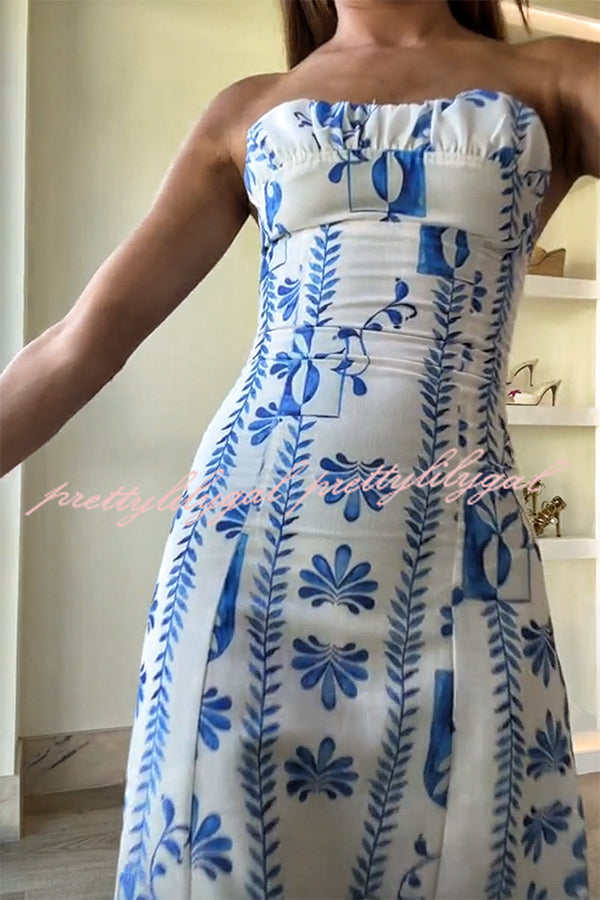 Freya Linen Blend Floral Wave Print Ruched Bust Strapless Maxi Dress