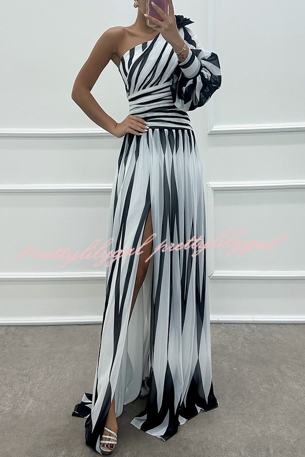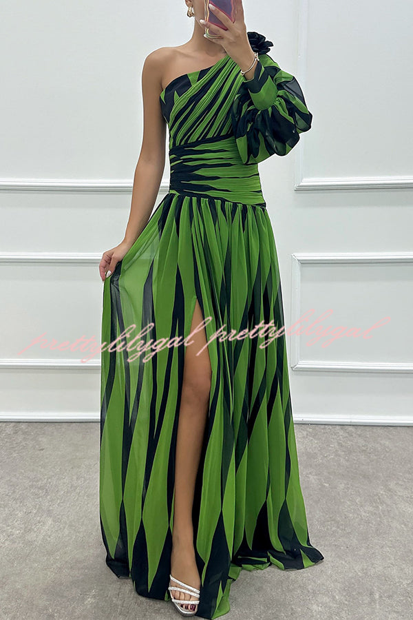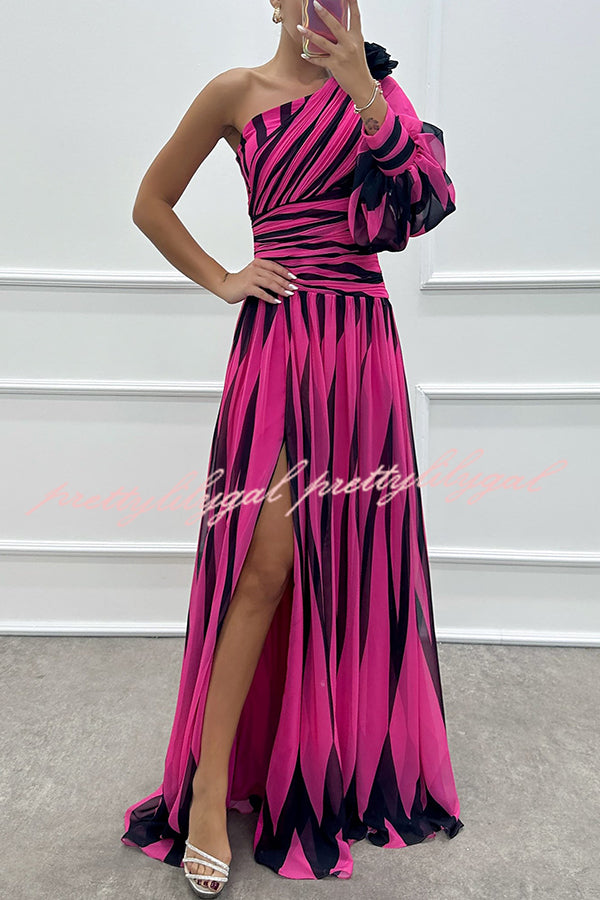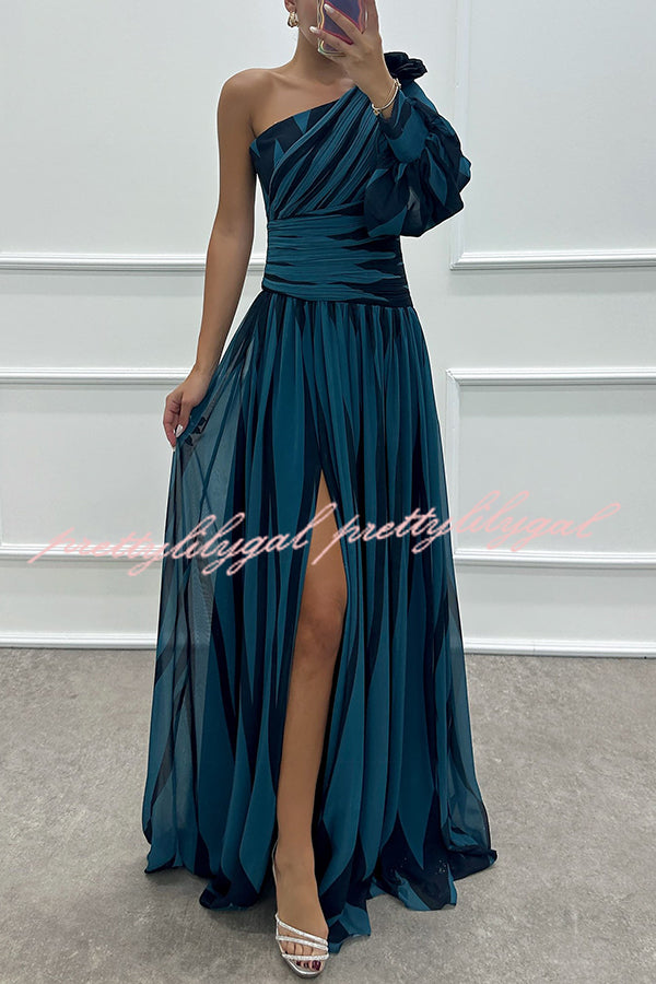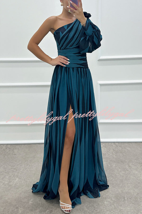 Purely Charming Printed Rose Pendant One Shoulder Pleated Slit Maxi Dress