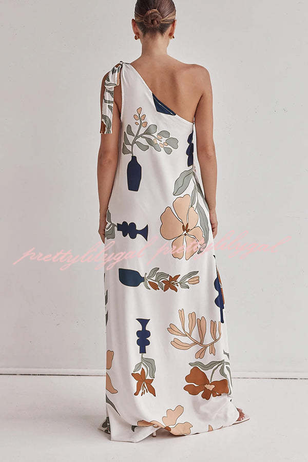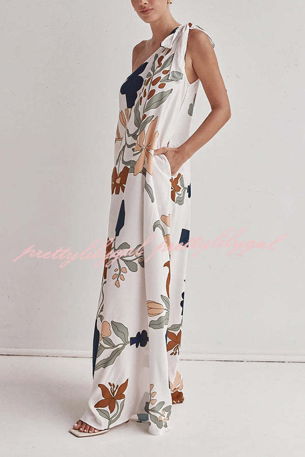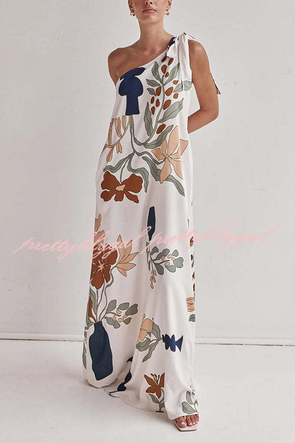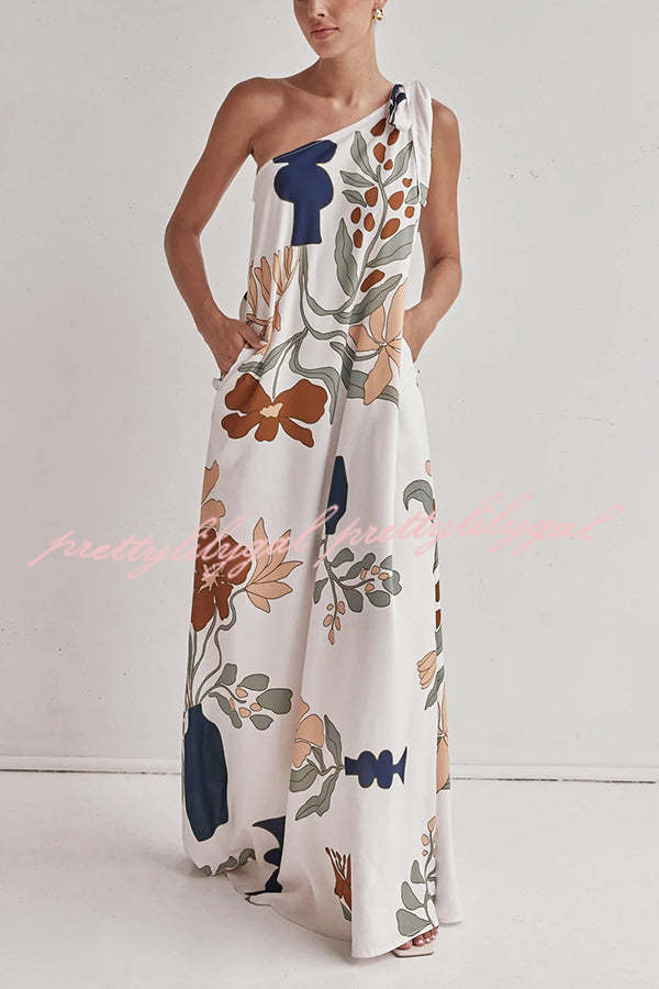 Matches The Vacation Unique Print One Shoulder Tie-up Pocketed Loose Maxi Dress