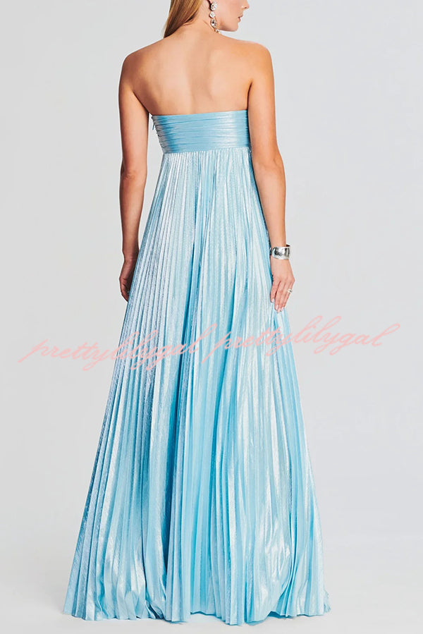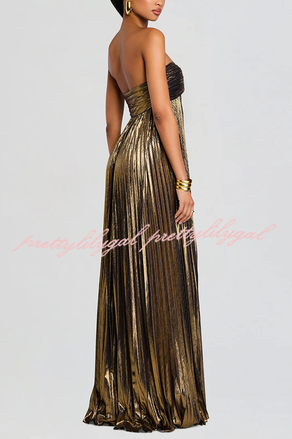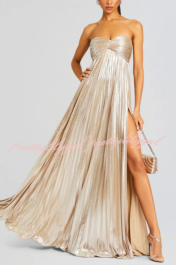 Metallic Sexy Tube Top Pleated High Slit Maxi Dress