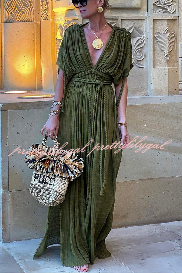 Greek Style Linen Blend Draped Braids Kimono Cover Up Slit Maxi Dress