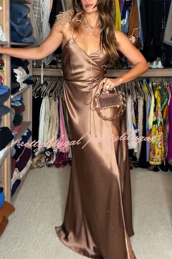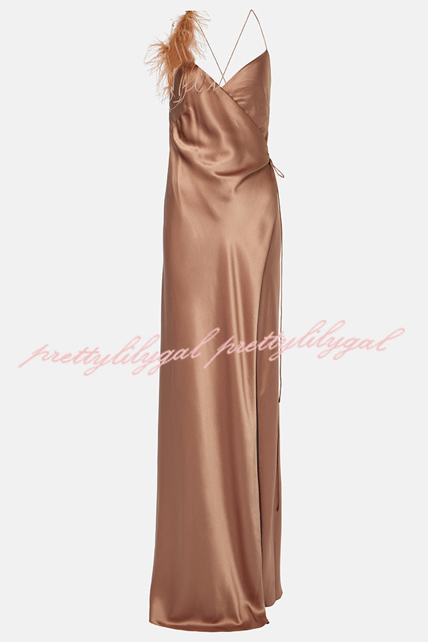 Celebration Night Satin Feather Trim Wrap Tie-up Slit Gown Maxi Dress