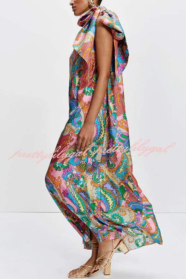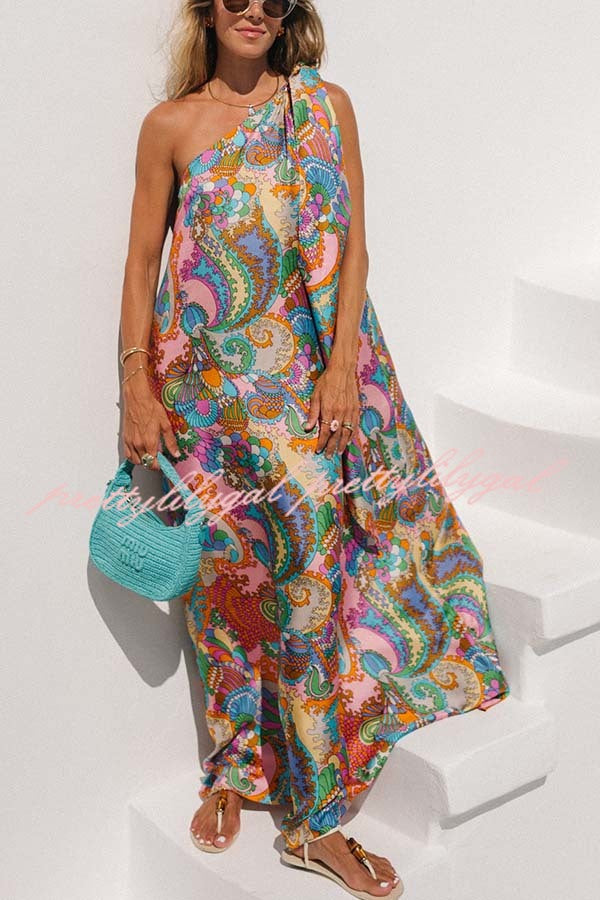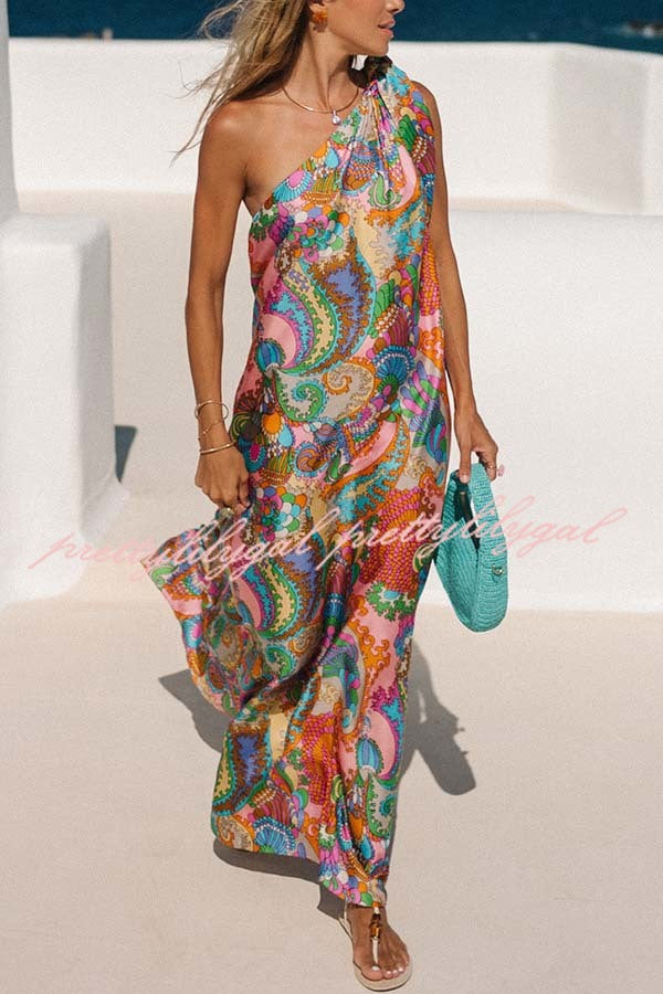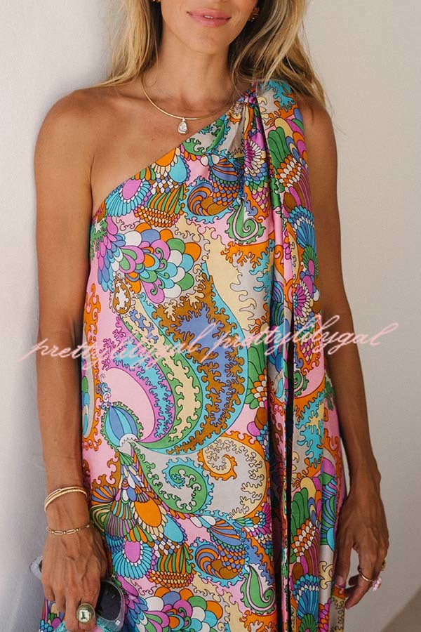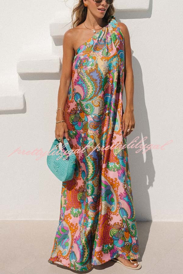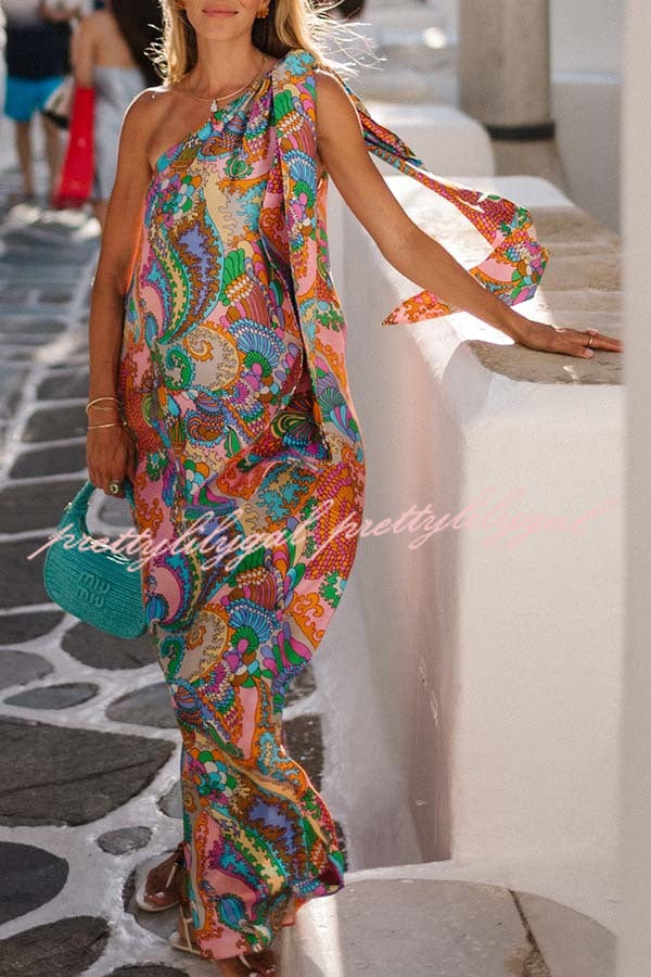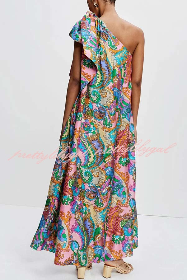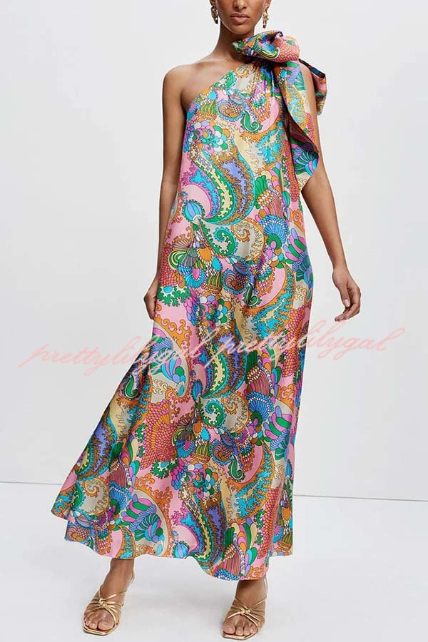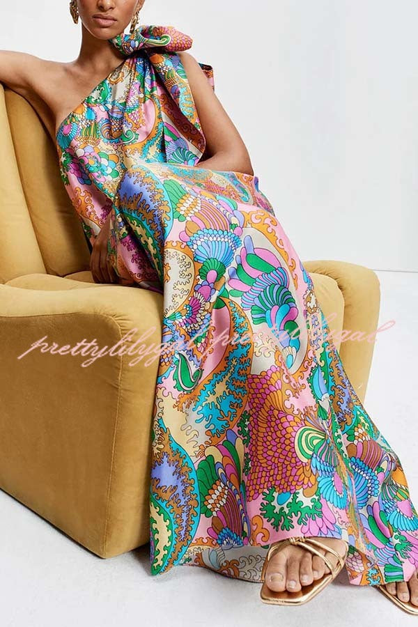 Rainbow Breeze Satin Unique Print Bow One Shoulder Loose Maxi Dress