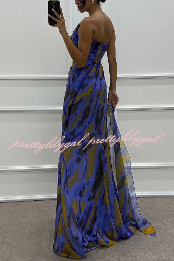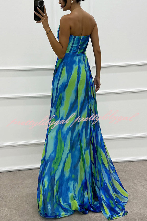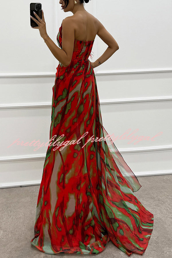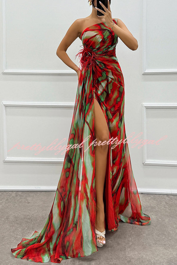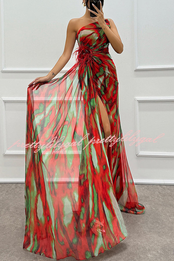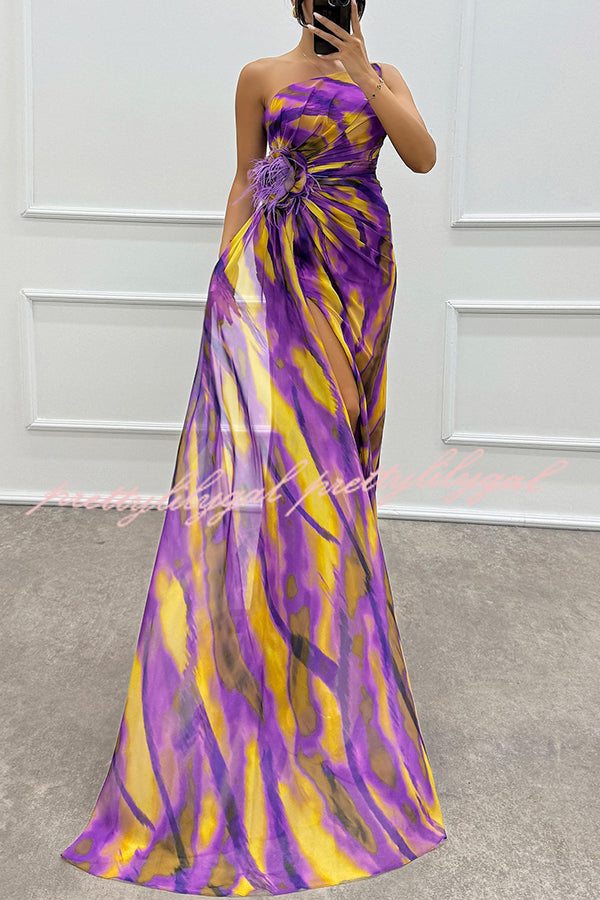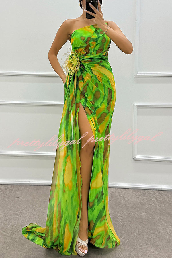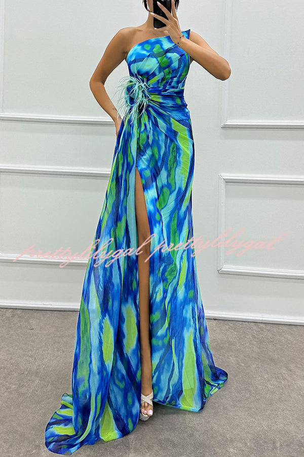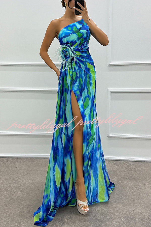 Amazing Views Watercolor Print Feather Rose Detail Off Shoulder Pleated Slit Maxi Dress