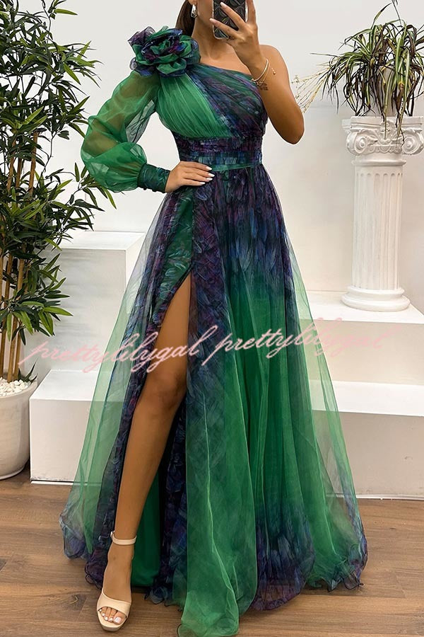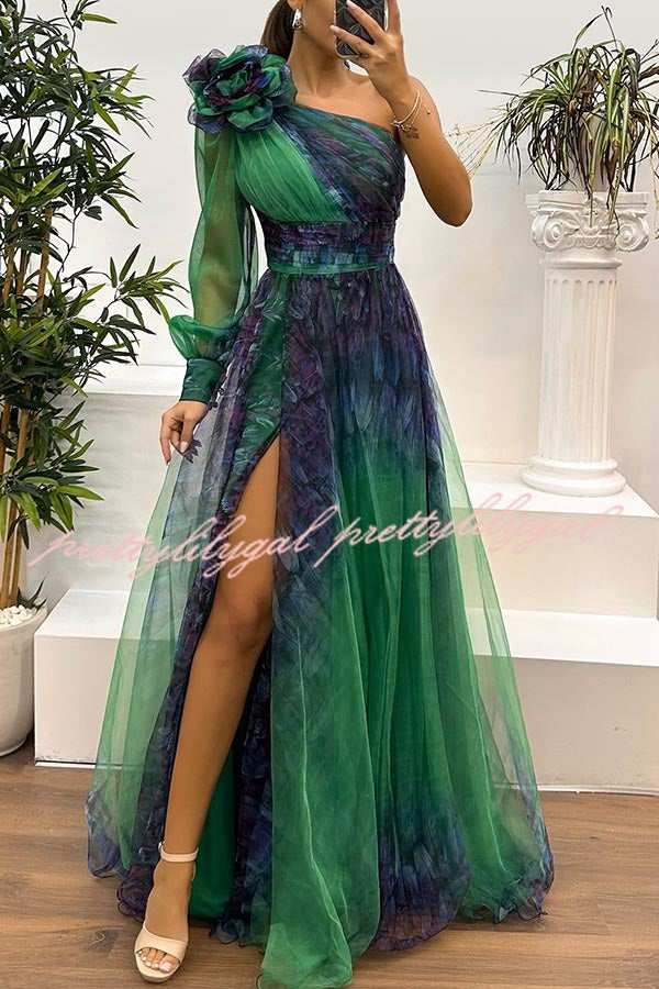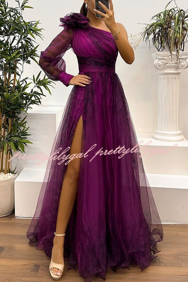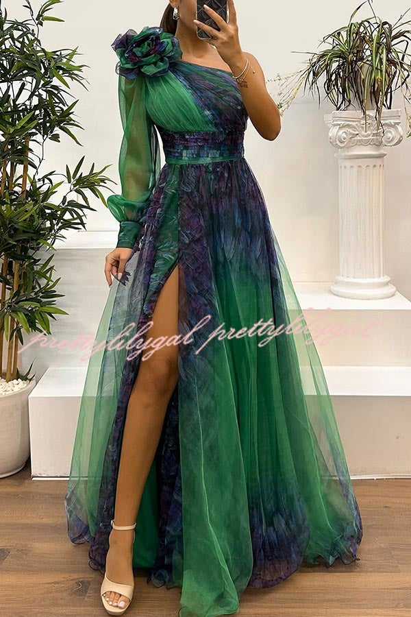 Guest List Tulle Printed Flower Pendant One Shoulder Pleated Slit Maxi Dress