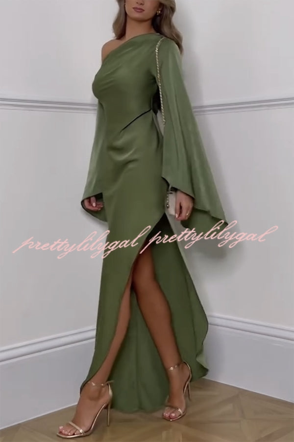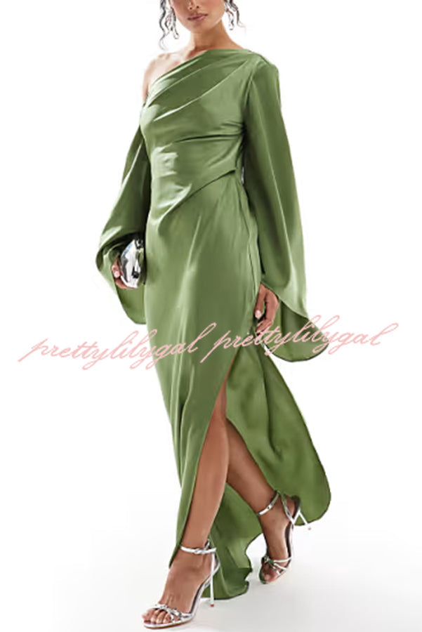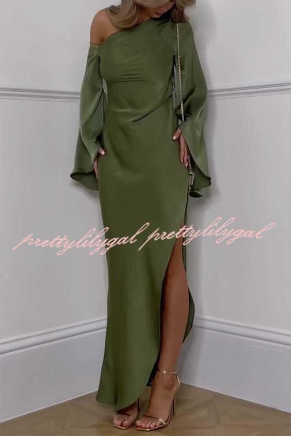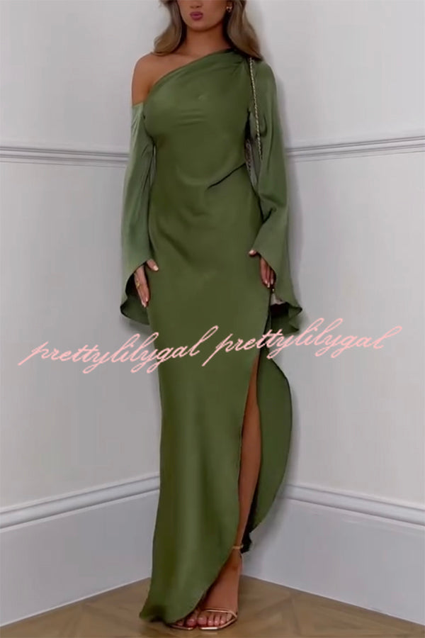 Zayla Satin Asymmetrical One Shoulder Bell Sleeve Slit Maxi Dress