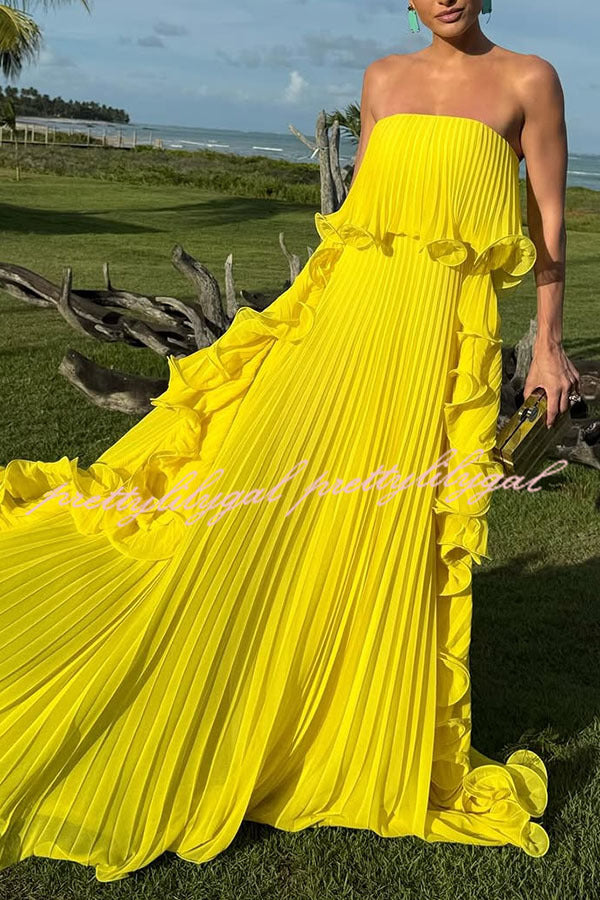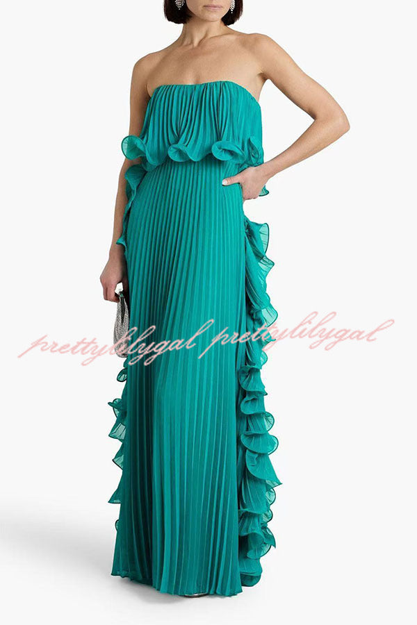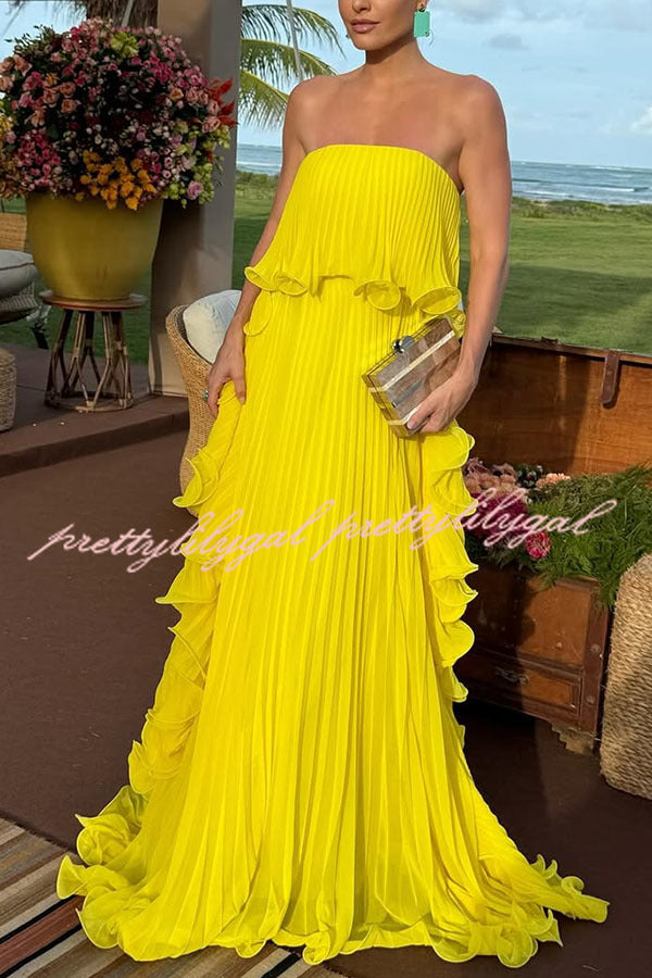 Reina Chiffon Pleated Wavy Ruffles Trim Strapless Loose Maxi Dress