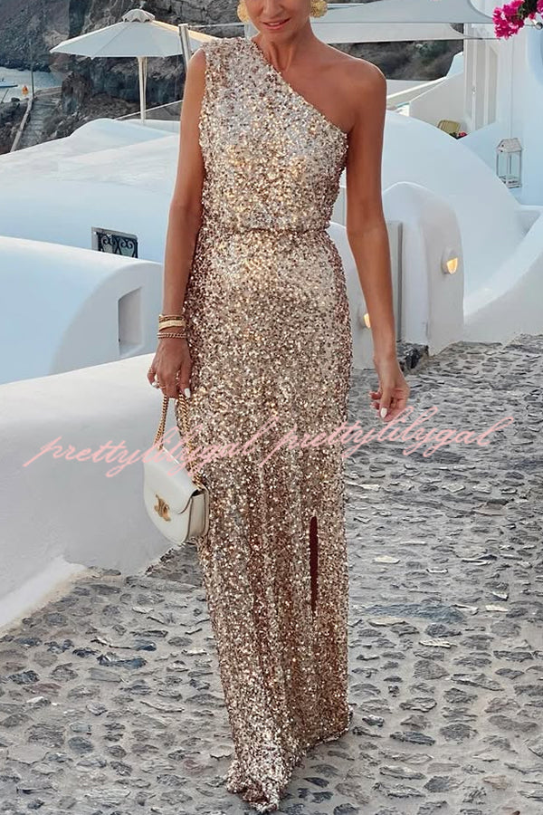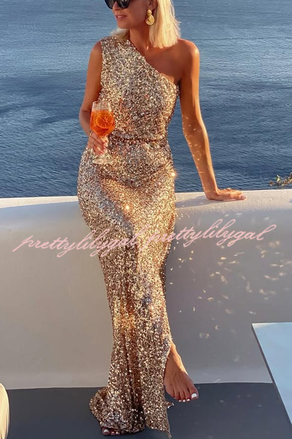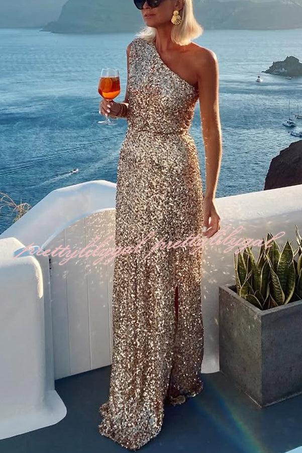 Santorini Night Sequin Fabric One Shoulder Slit Maxi Dress