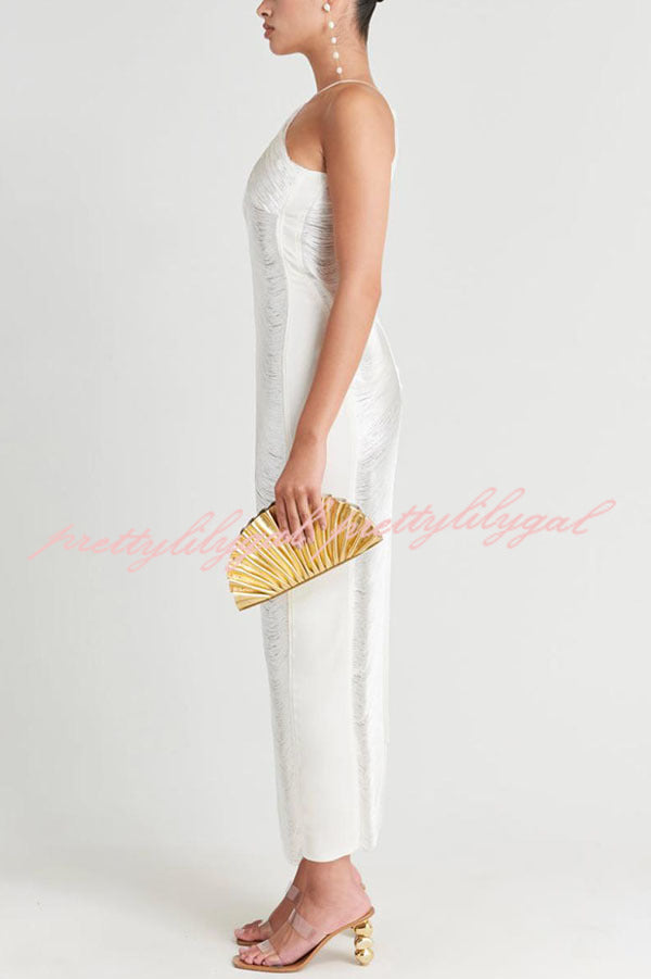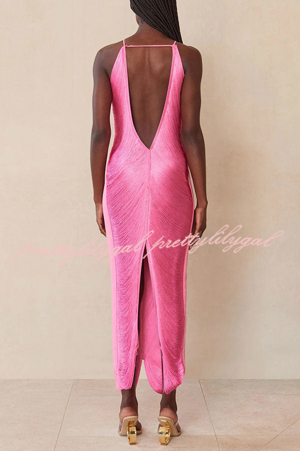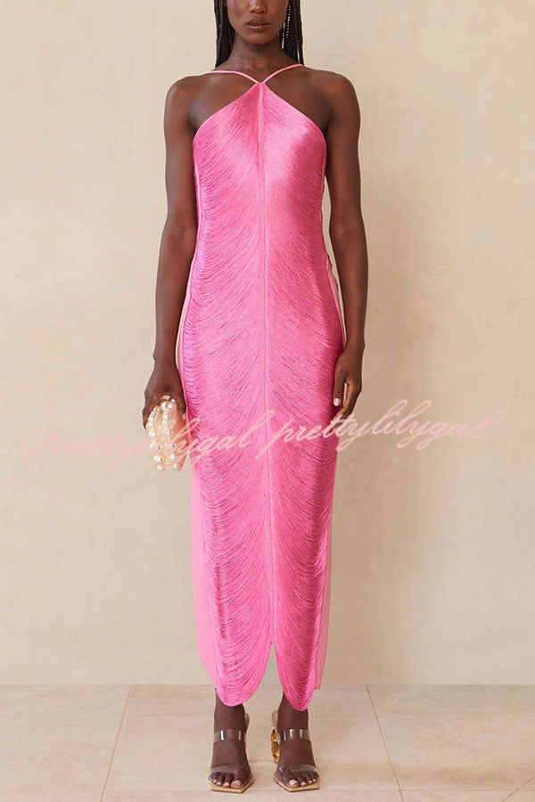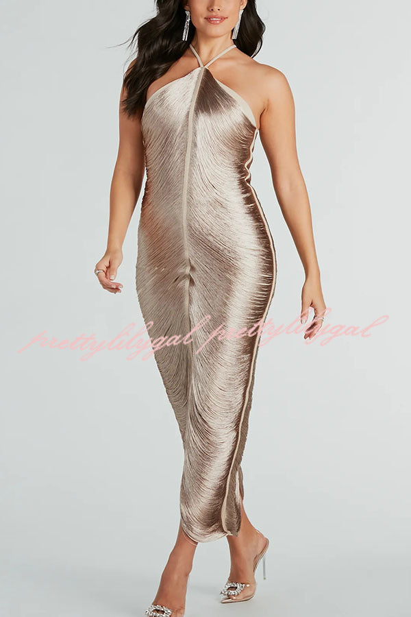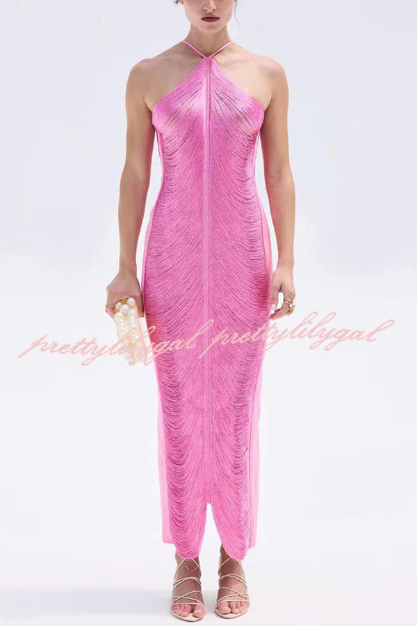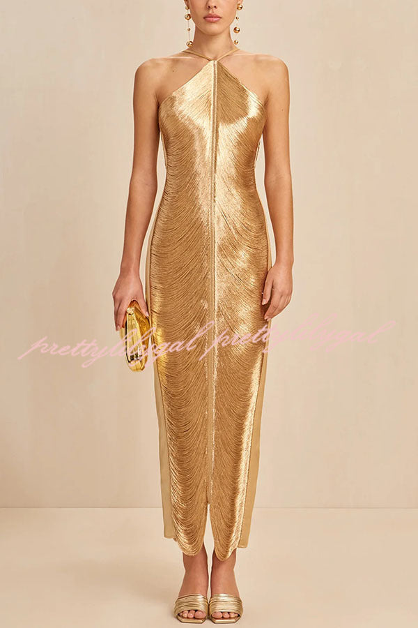 Sexy Allnight Metallic Halterneck Backless Fringed Slit Maxi Dress