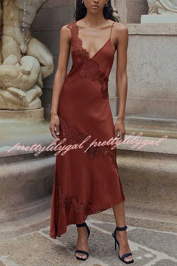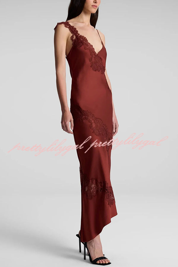 Sexy Lace Stitching Suspender V-neck Asymmetrical Maxi Dress