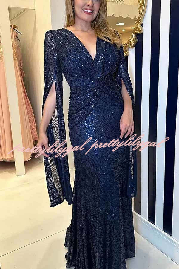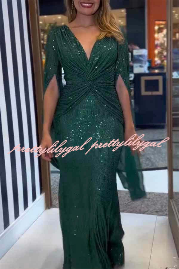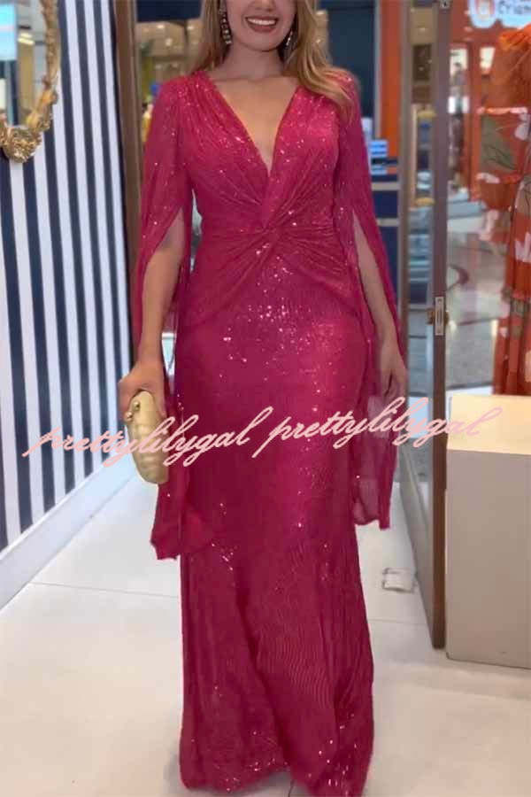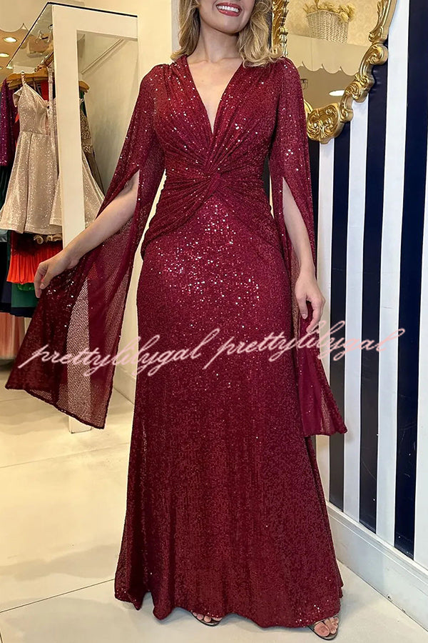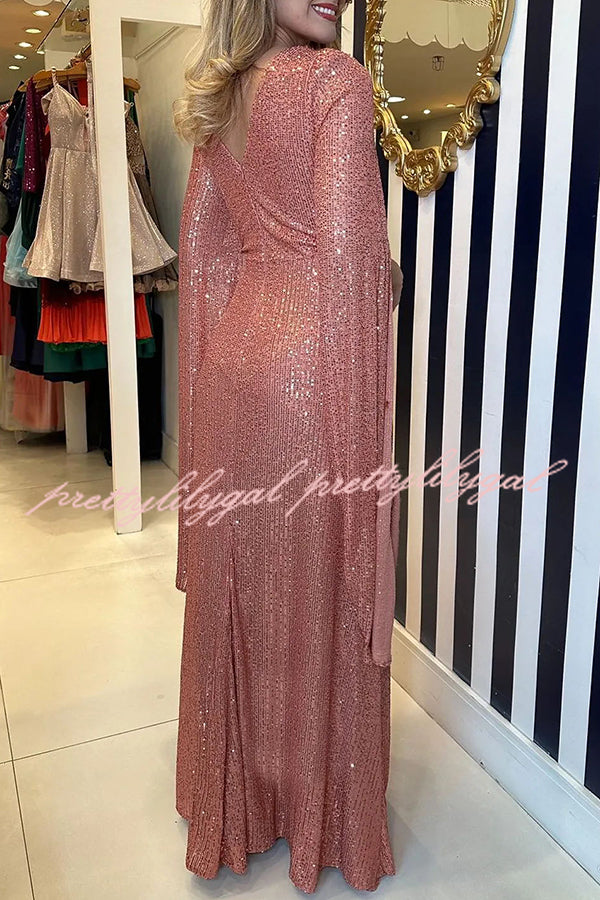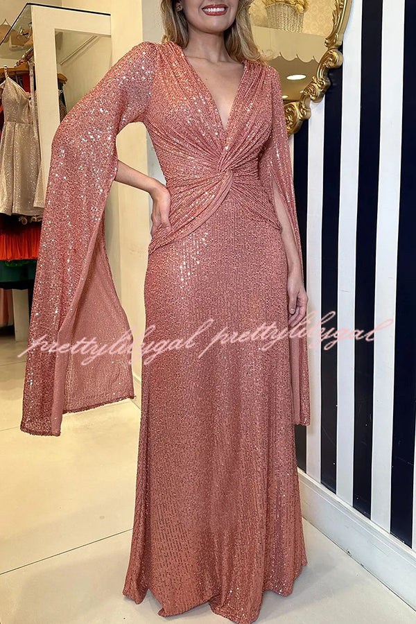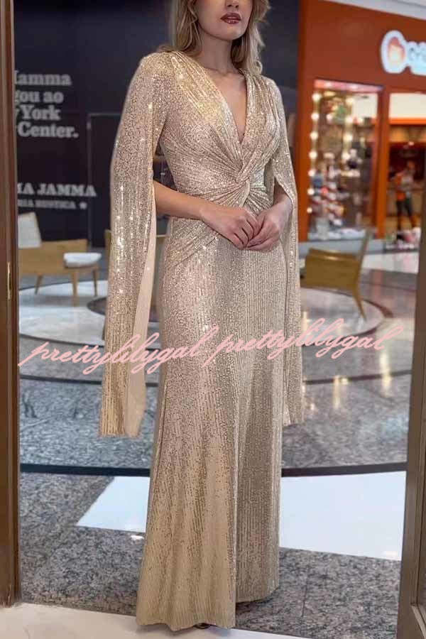 Shine Brighter Sequin Cape Sleeve Cross Waist Evening Maxi Dress