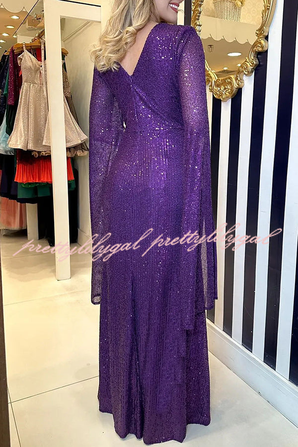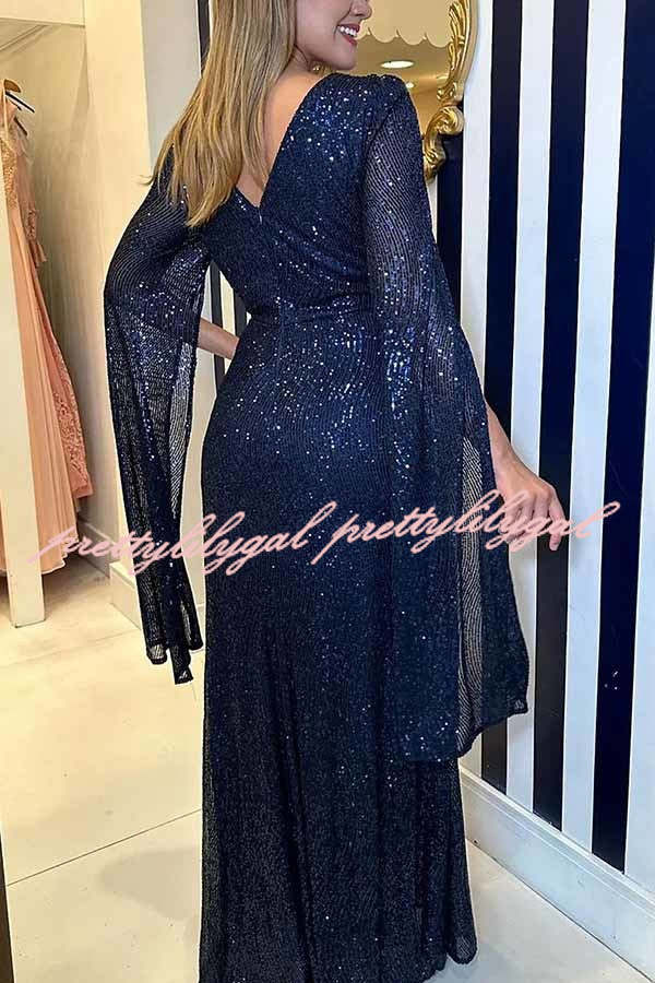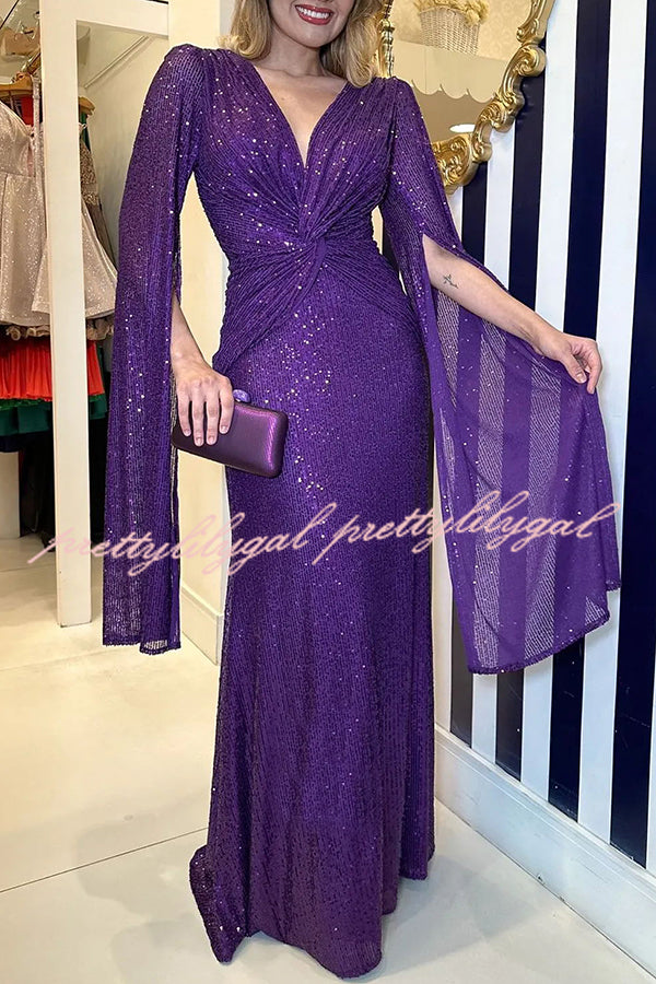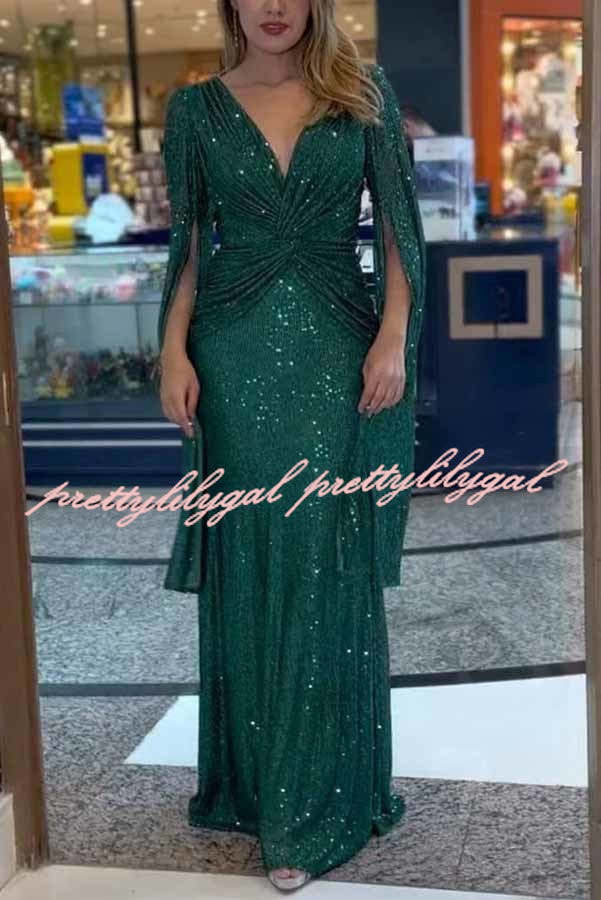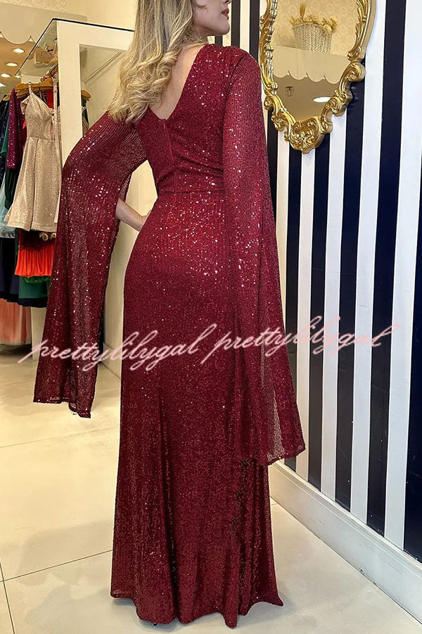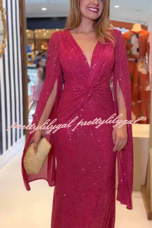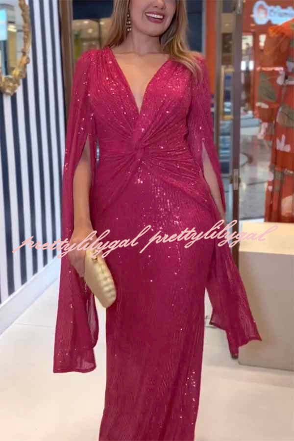 Shine Brighter Sequin Cape Sleeve Cross Waist Evening Maxi Dress