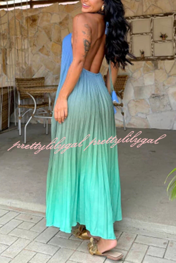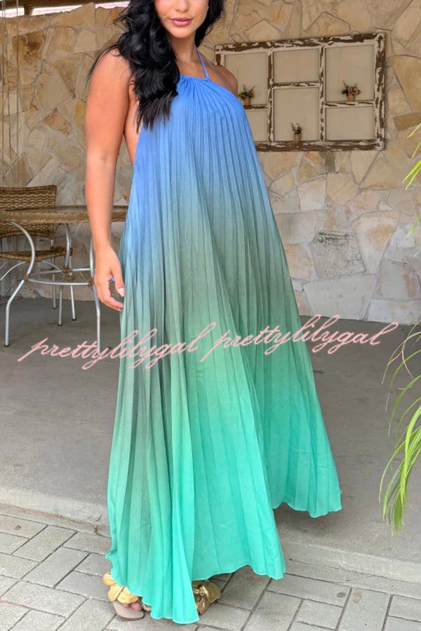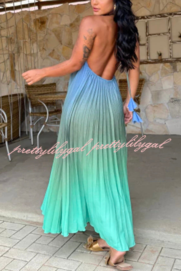 Sea goddess Gradient Print Pleated Halter Backless A-line Maxi Dress
