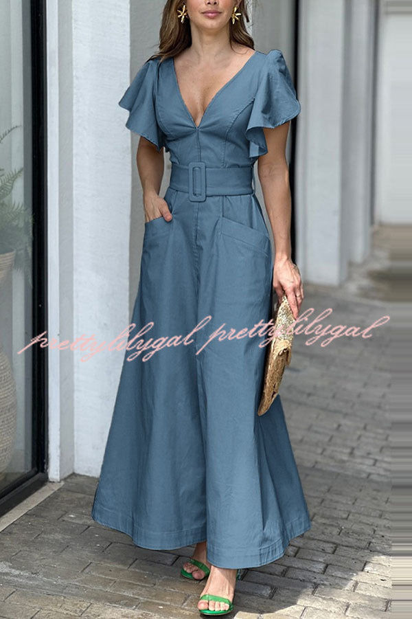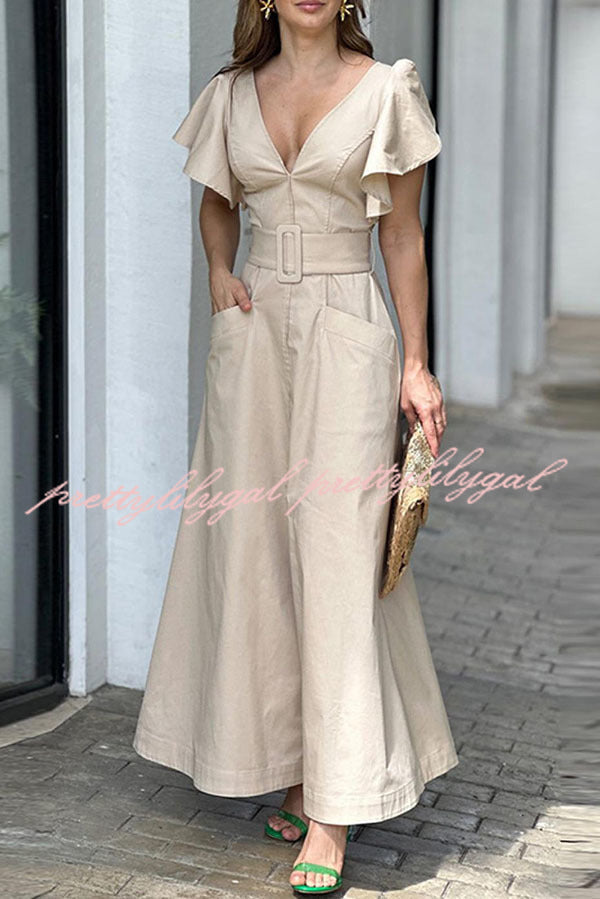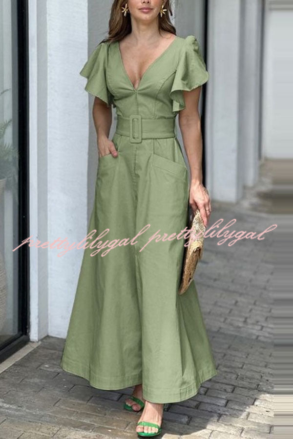 Solid Ruffle Sleeve V Neck High Waist Pocket Maxi Dress