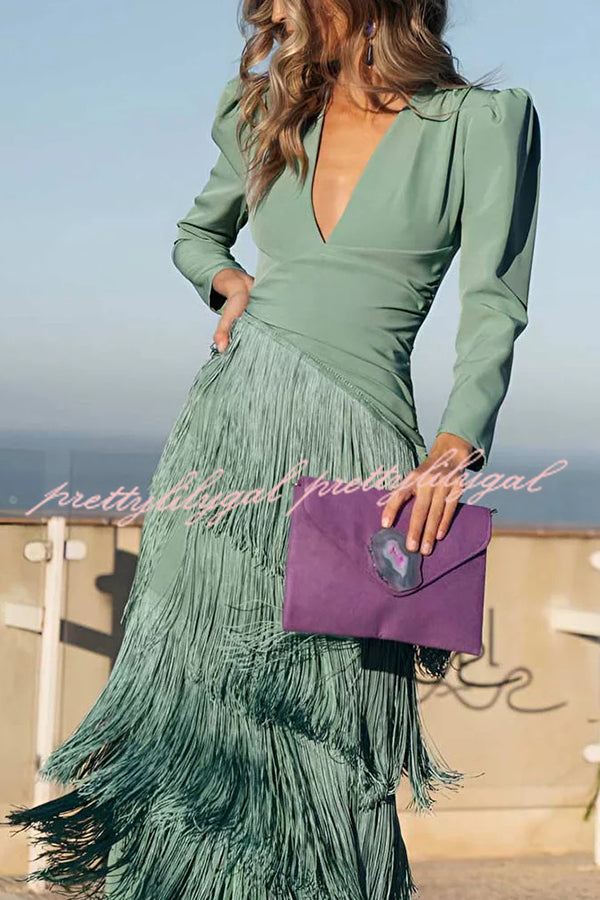 Solid Color V-Neck Long Sleeve Elegant Tassel Maxi Dress