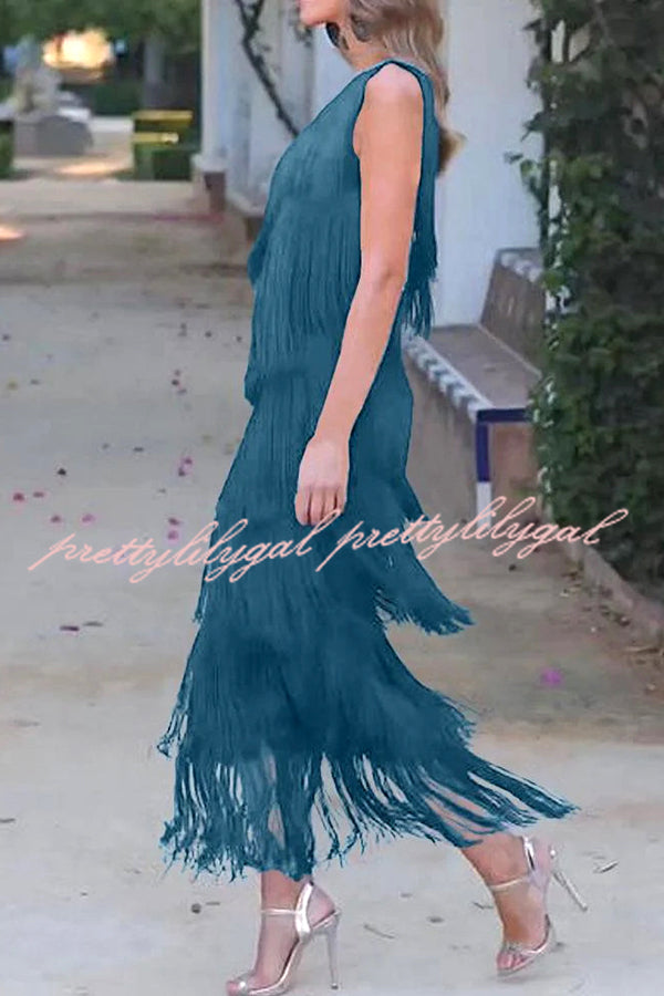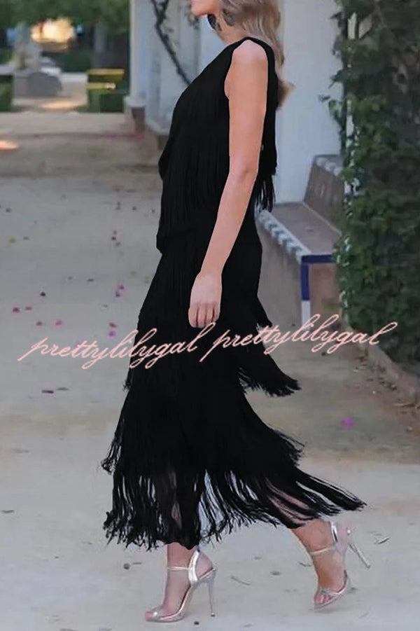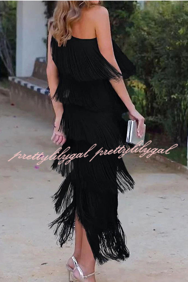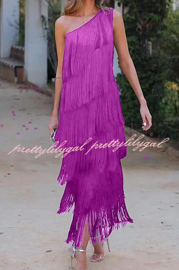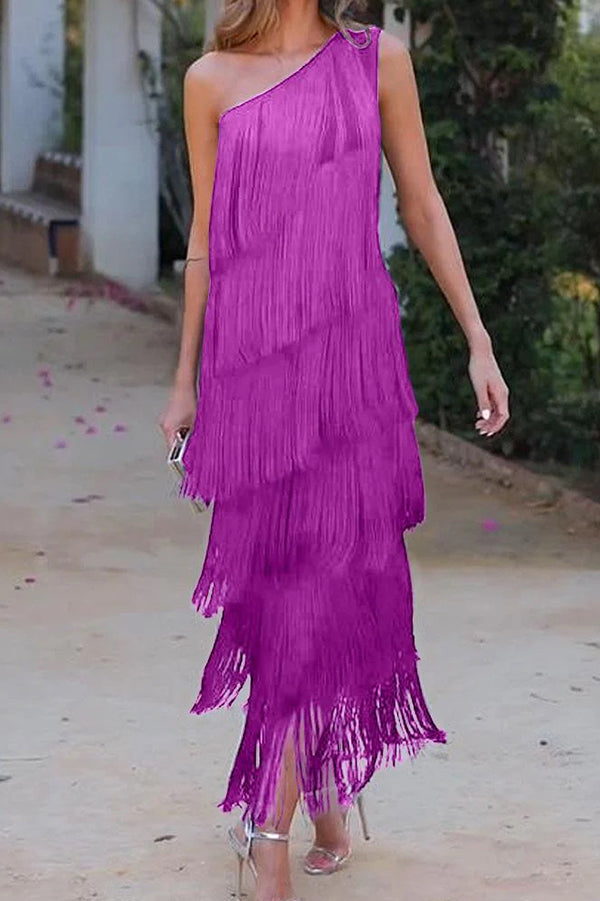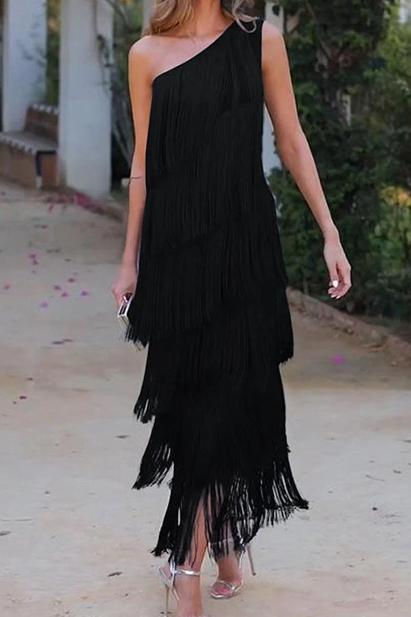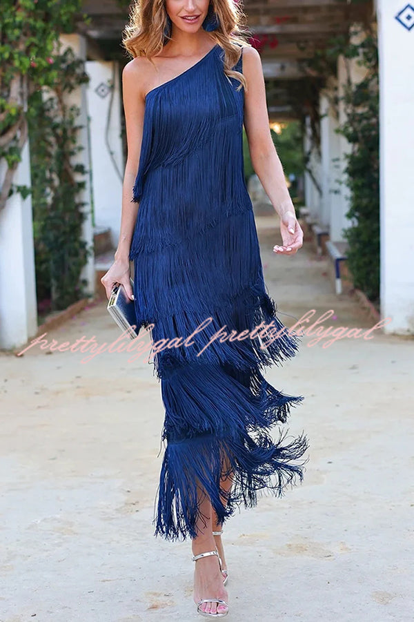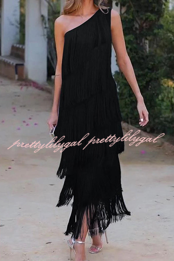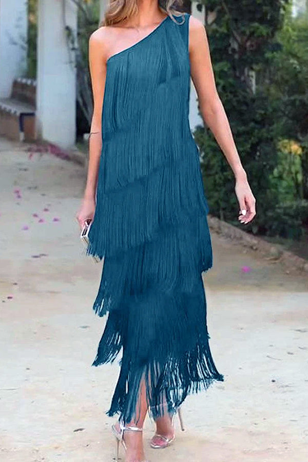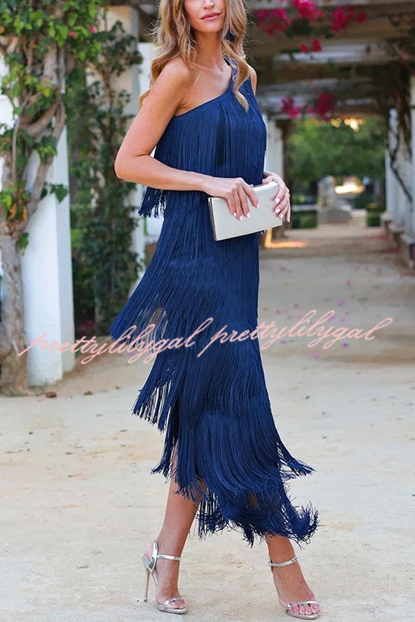 Stylish Fringed One Shoulder Asymmetric Midi Dress