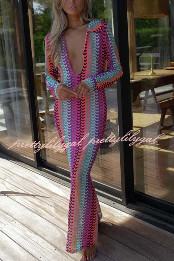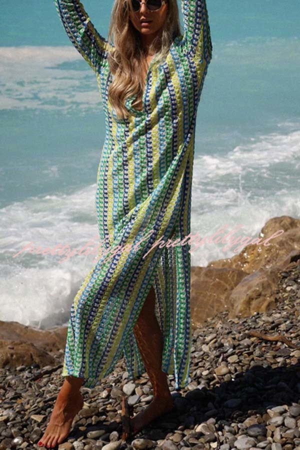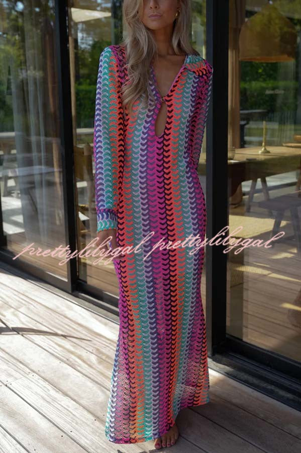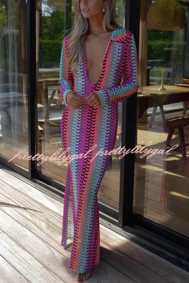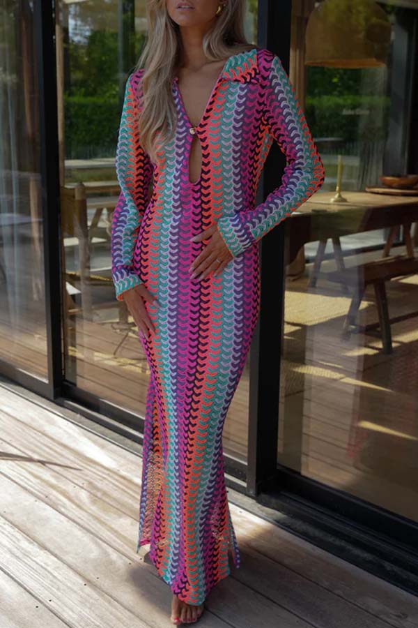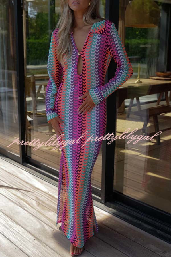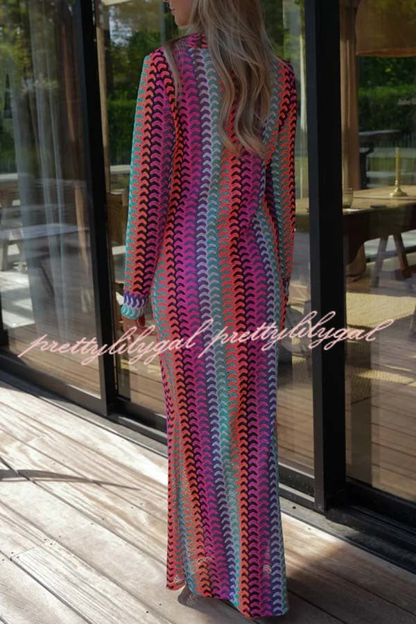 Eleanor Knit Colorful Wave Unique Print Shirt U-neck Long Sleeve Slit Maxi Dress