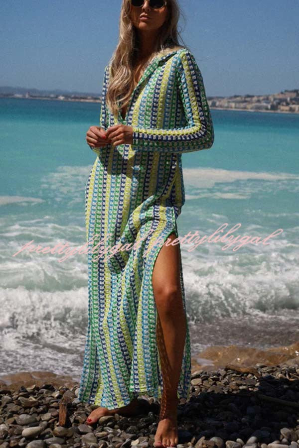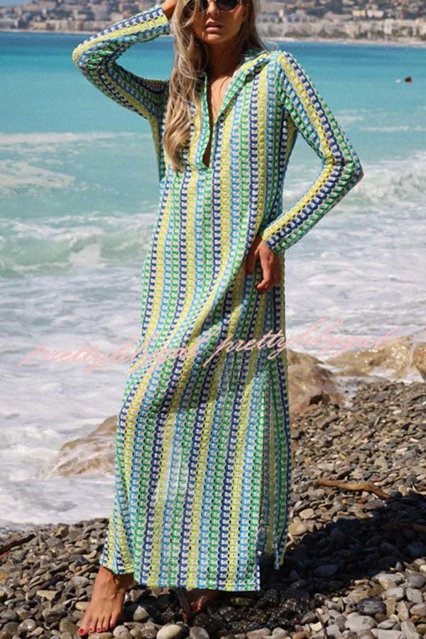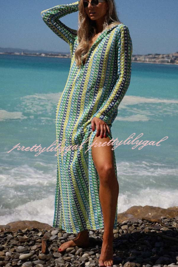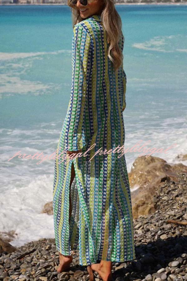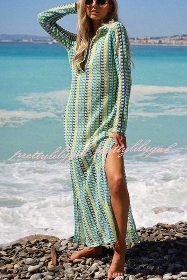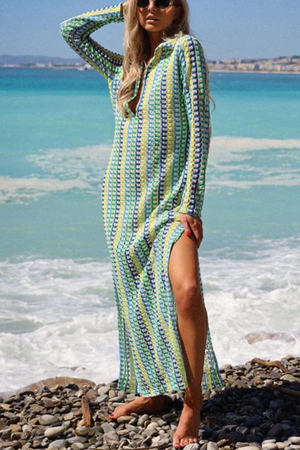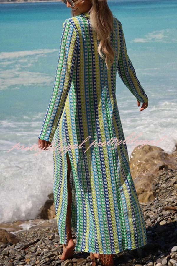 Eleanor Knit Colorful Wave Unique Print Shirt U-neck Long Sleeve Slit Maxi Dress