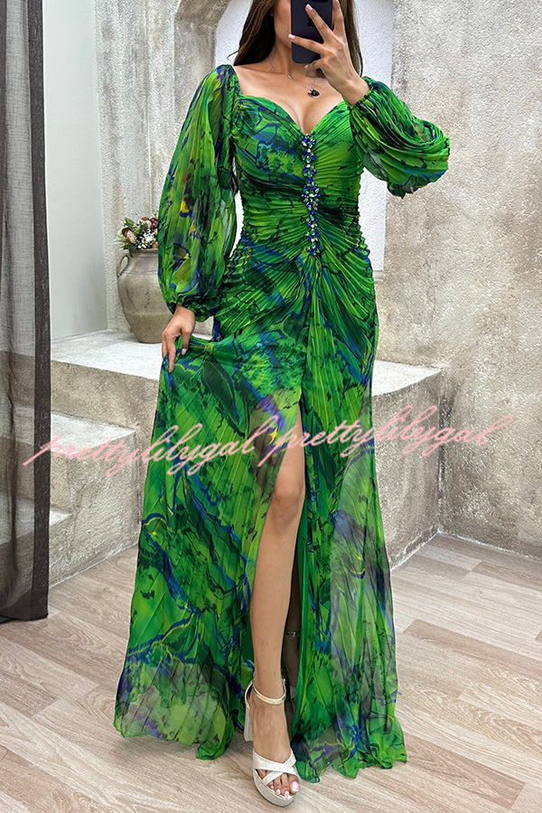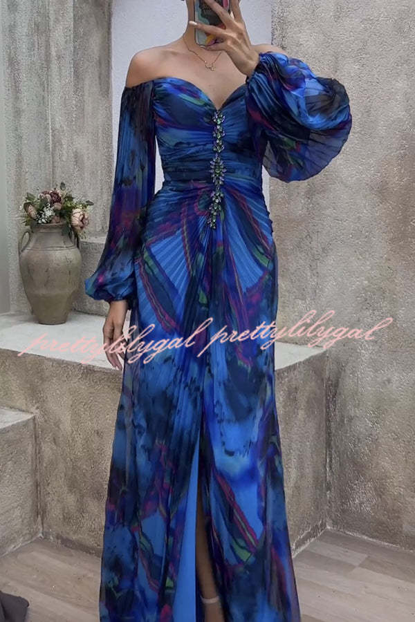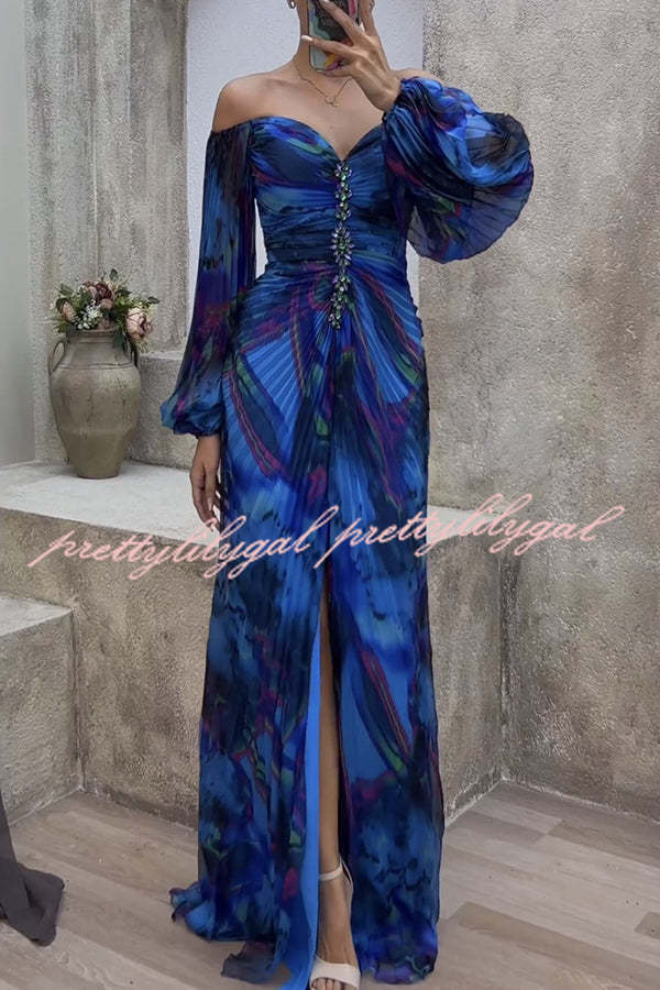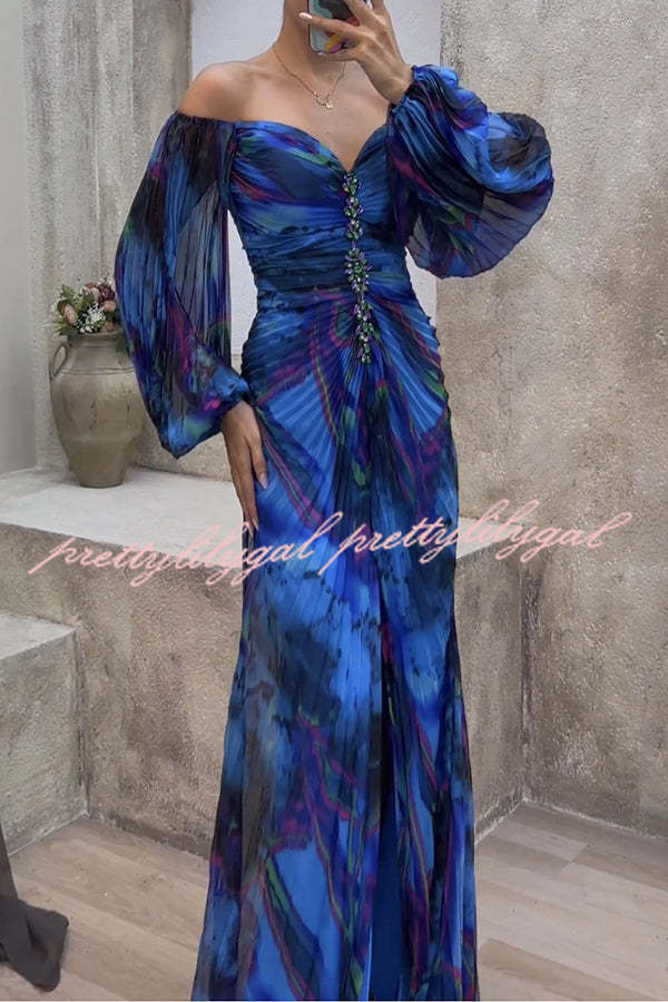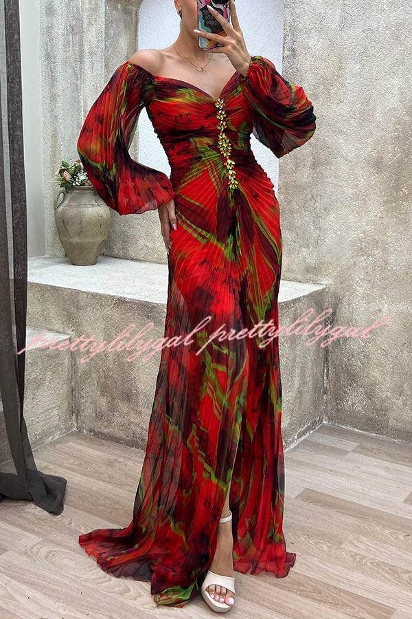 Sunset Serenade Printed Off Shoulder Diamond Embellished Pleated Slit Maxi Dress