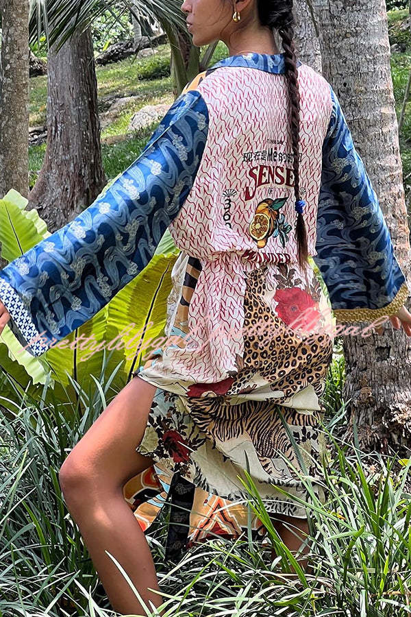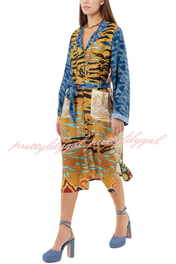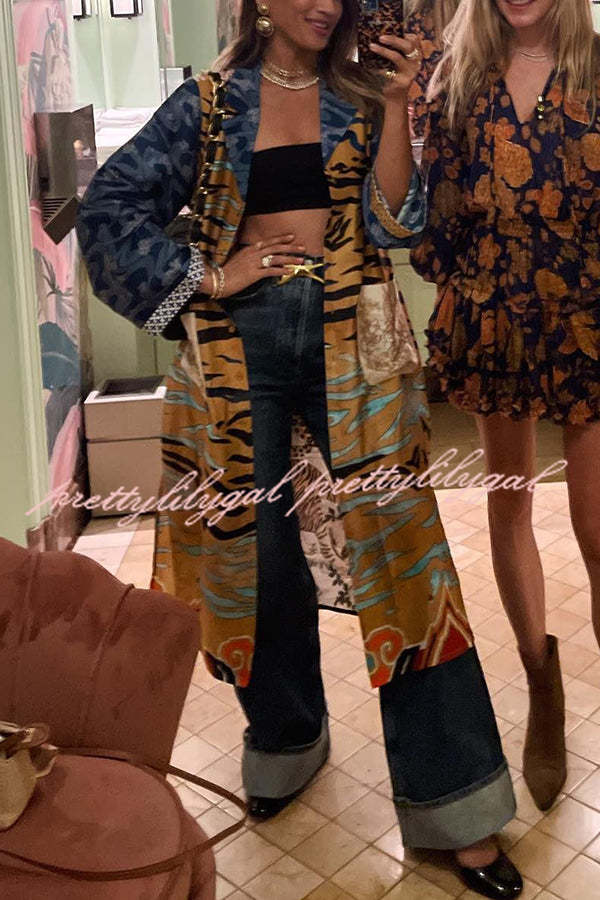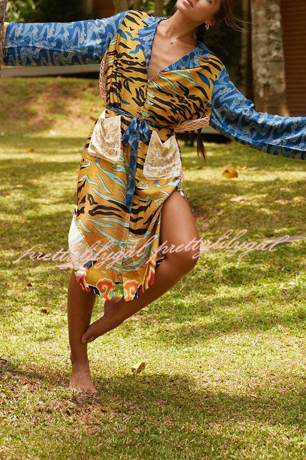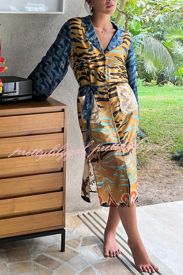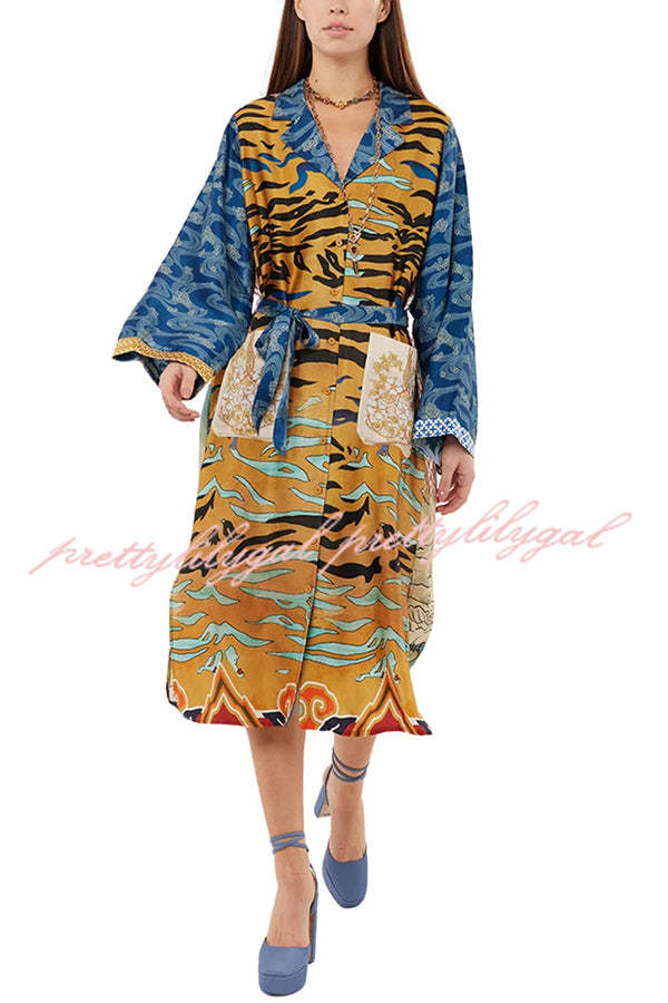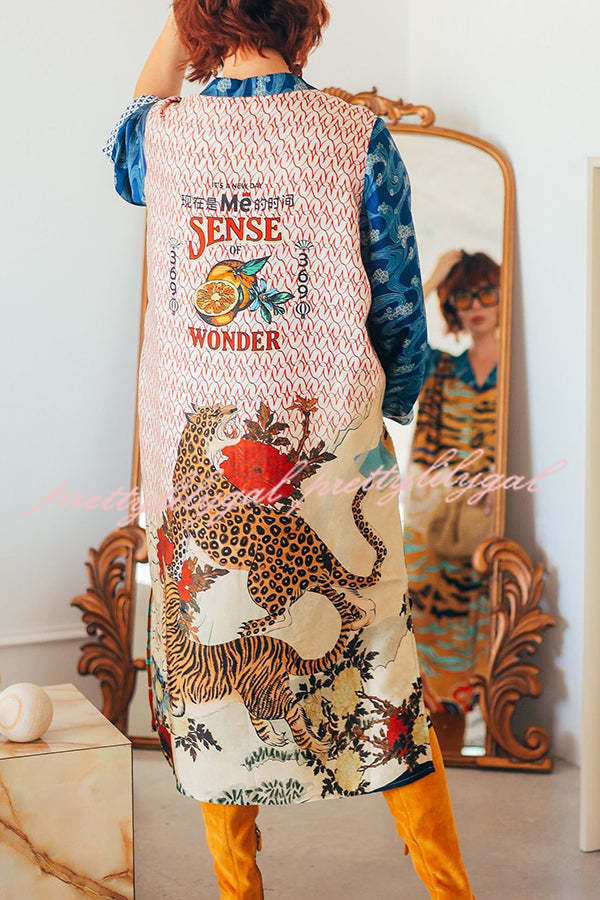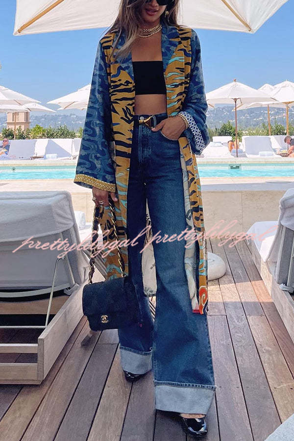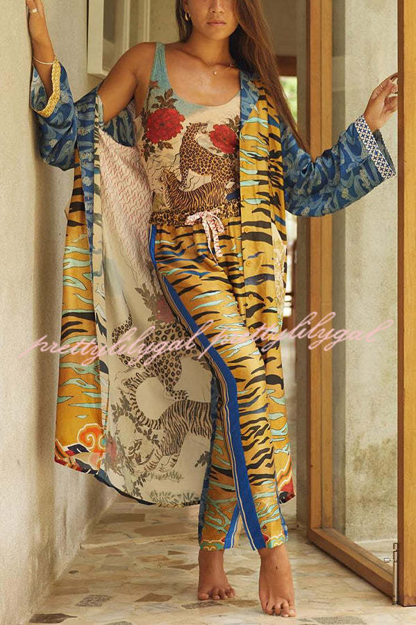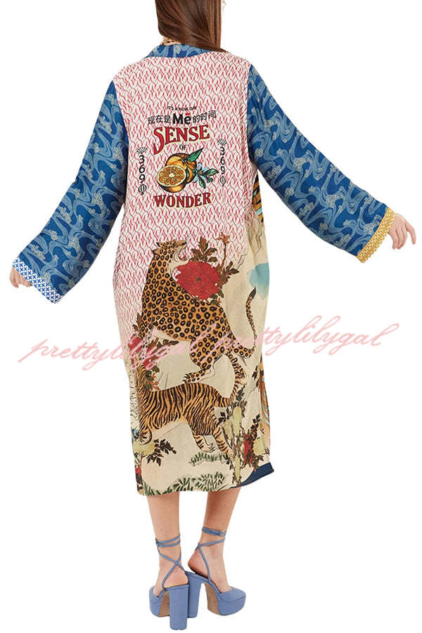 Tropical Jungle Tiger Unique Print Long Sleeve Belt Pocketed Kimono Coat