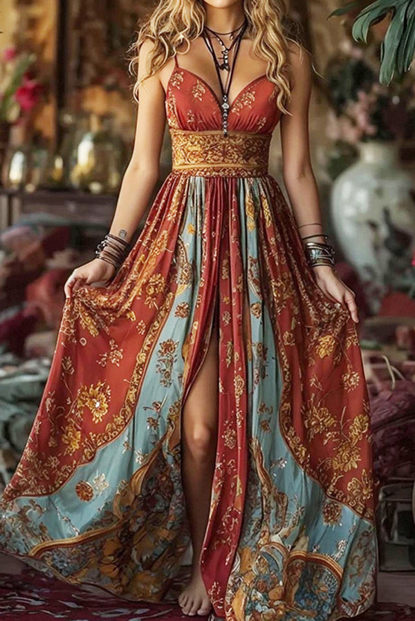 Unique Printed Open Back Pleated Waist Maxi Dress