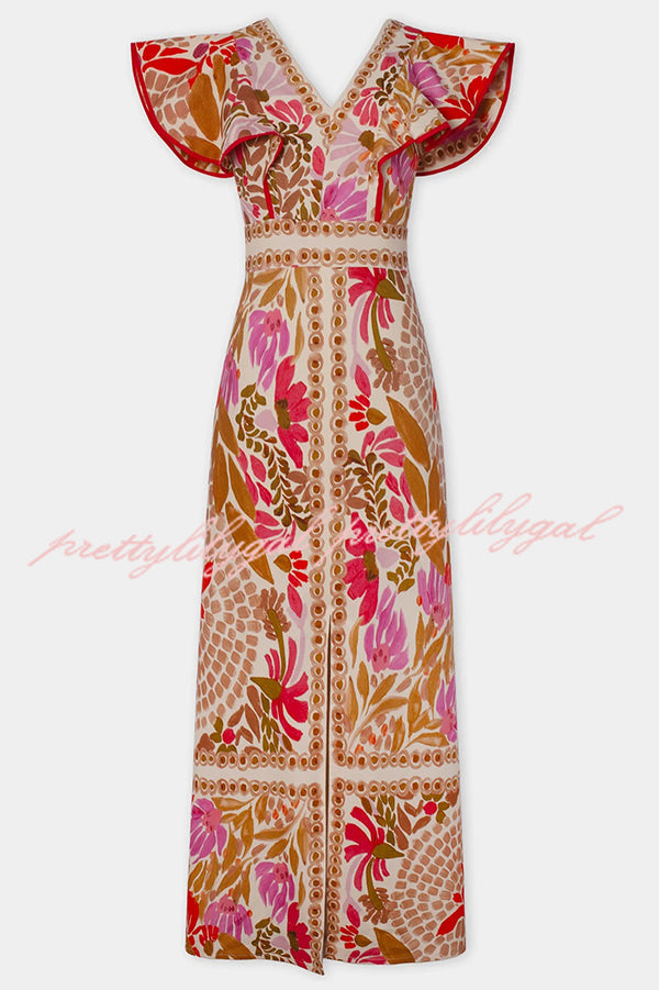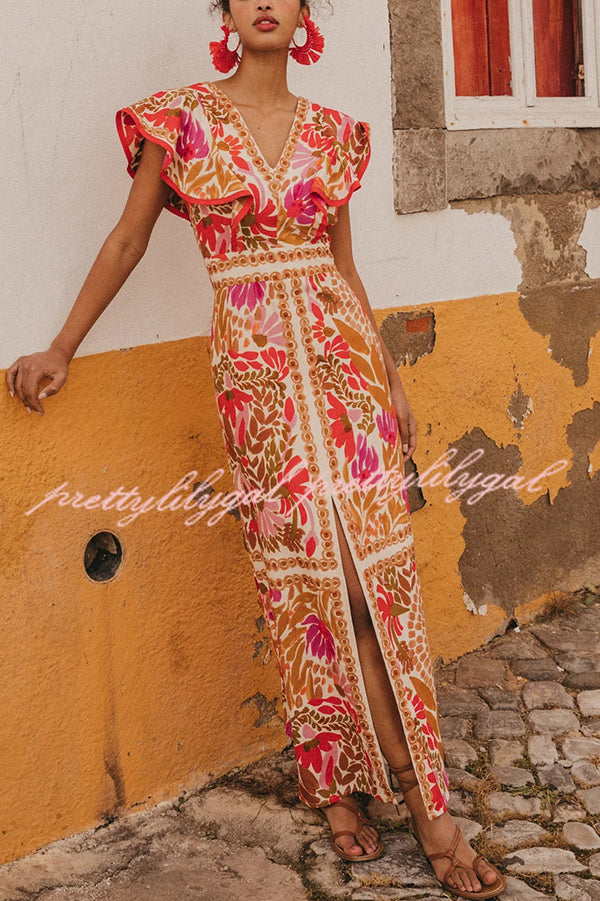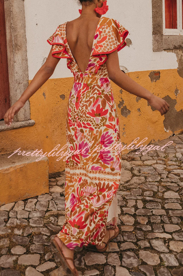 Unique Printed V-neck Open Back Ruffled Sleeves Slit Maxi Dress